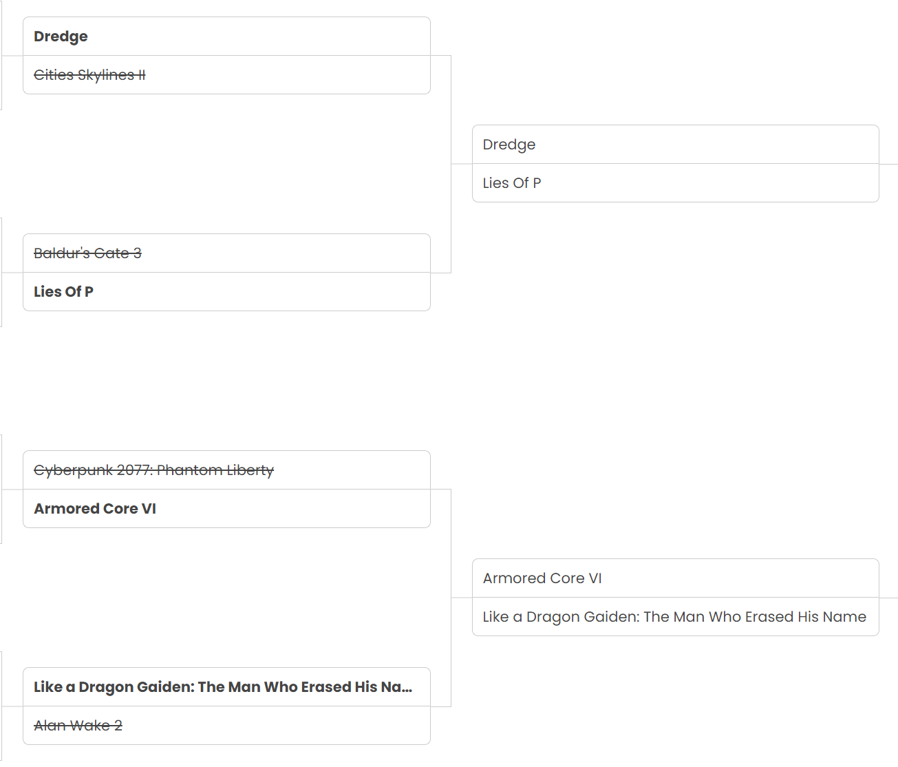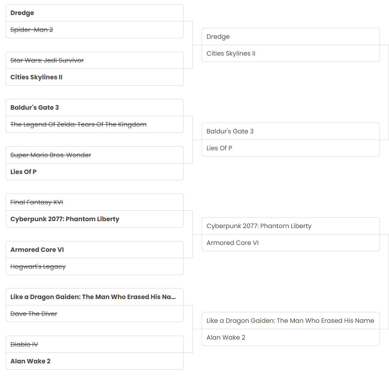 And that's that for the quarter-finals! We're now only two posts away from finding out who the winner of our 2023 Game Of The Year award is. Join us next time for the semi-finals!