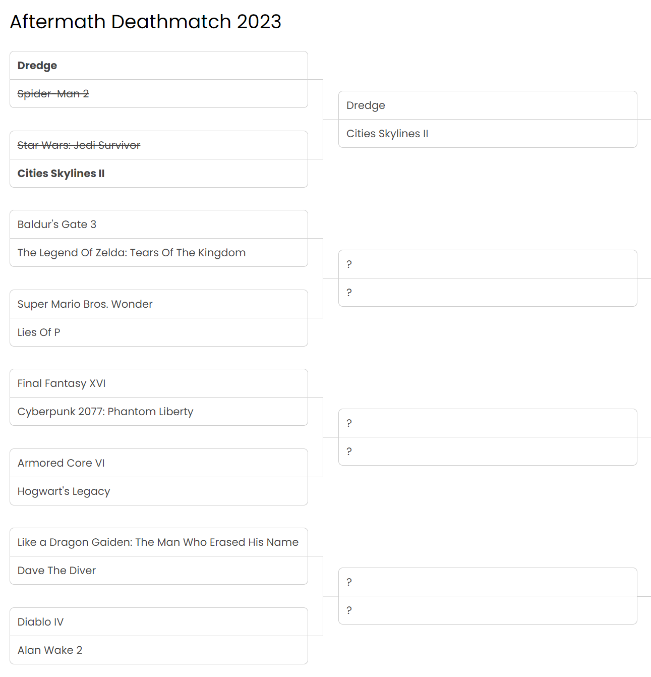Anyway, a rules reminder! There are 16 games in the mix for Game of the Year 2023. We're pitting them against each other in a knockout tournament. But we're not pitting the games themselves against each other; instead, we're selecting a Champion from in or around each game and having them duke it out in the arena in hand-to-hand (or weapon-to-weapon, or hand-to-weapon) combat. The winner, decided via a schoolyard "would Batman beat Superman" style debate, moves on. The loser does not. Here's how things stand after two bouts: