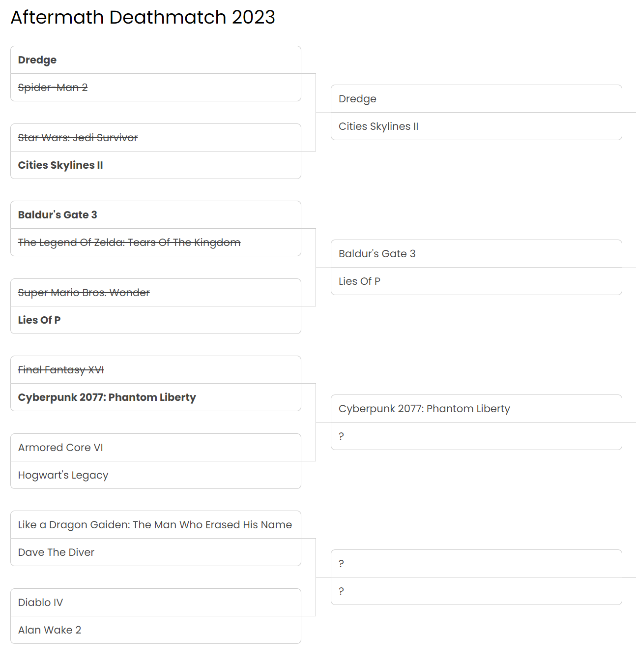 Welcome, everyone, to the arena! It is once more time to pit two of 2023's biggest video games against each other, and once more time to see which one emerges victorious to move onto the next round of Aftermath's Video Game Deathmatch.