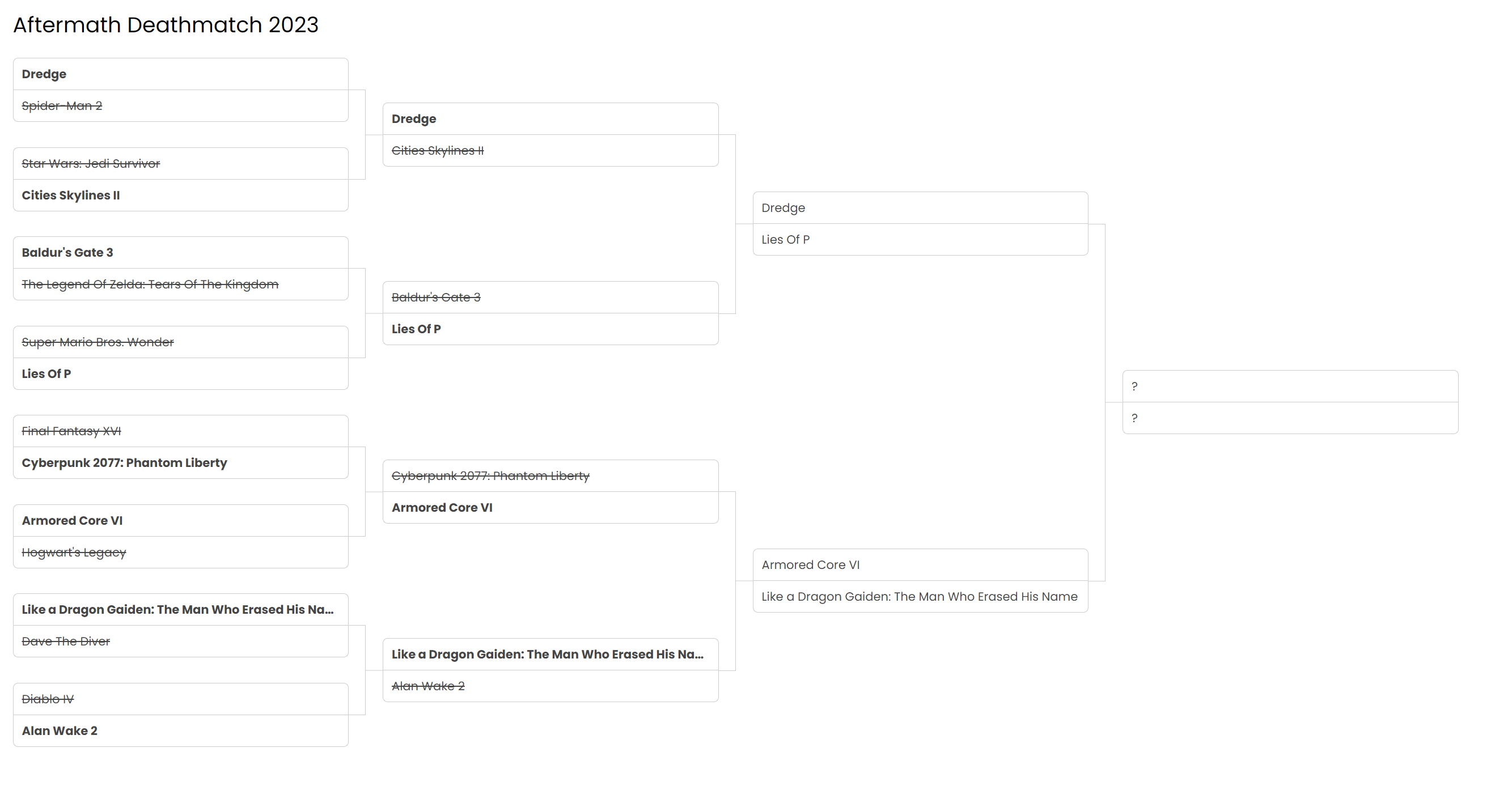 Let's get into it! First up will be Dredge (represented by The Little Boat From Dredge) taking on Lies Of P (represented by P), followed by Armored Core VI (Balteus) going up against Yakuza (Kazuma Kiryu/Joryu).