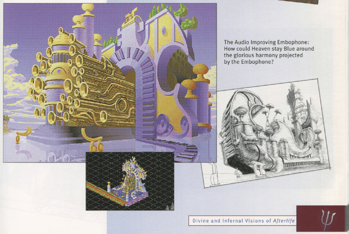 The art style of Afterlife also sets it apart, and not just from every other Lucasarts game. In the very rare strategy guide, Pablo Mica (credited in the game as Paul Mica), said he took influence from H.R. Giger, and described the intended look of Hell as “intestinal.” Along with Bryan Rich and Kevin Evans, they crafted a world that was surreal, funny, distinctly alien, and disgusting to look at, with the closest possible analogue being the Oddworld series, which would kick off the following year.