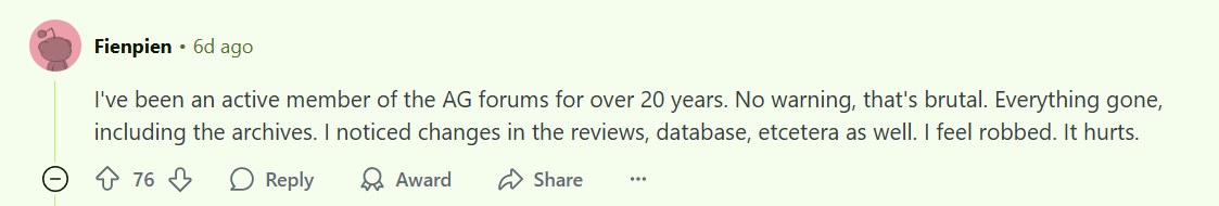 Earlier this month the site's forums, and its decades of history, were wiped without notice, along with AG's user reviews of games. While some of the content has been saved in web archives, to delete that past at all, let alone without warning, is an extremely shitty move from the site's owners.