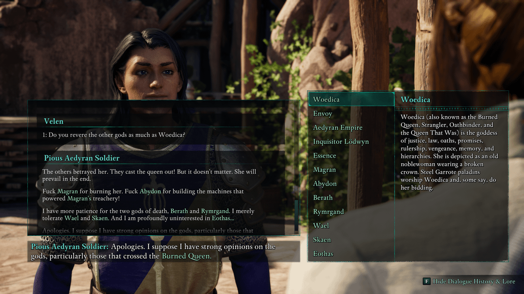 I'm even more impressed with the button on the right. Avowed basically shipped with a wiki attached to its conversation system, so whenever a character or location or even concept from the Pillars of Eternity universe is mentioned, you can stop, check the conversation's logs and get a great little explainer on just who or what was mentioned. This has been life-changing to me, a guy who wanted to play this game in particular but isn't really a Pillars of Eternity guy, because now I'm fully up to speed about this universe's lore in ways I wasn't with, say, Baldur's Gate 3 even after 60-70 hours.