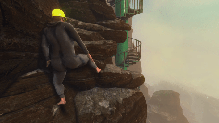I’ve been trying to climb the side of this sheer cliff face for several hours using only my feet. The path is tricky and winding but at this point I know the footholds better than the faces of some of my friends. Some of them involve slightly shimmying my feet on a thin ridge of rock. Others involve lifting my leg out from the cliff face, swinging it over, and planting my foot until I feel something firm enough to lift my body up. I misjudge a step, my character tumbles; his body ping pongs back and forth between the side of the path and the conveniently built spiral stairwell next to the path, his head catching the green steel railing. I feel numb at this point. My character groans, gets up, I try again. This is the Manbreaker in Baby Steps, an unpleasant task that I have been told I do not need to do.
