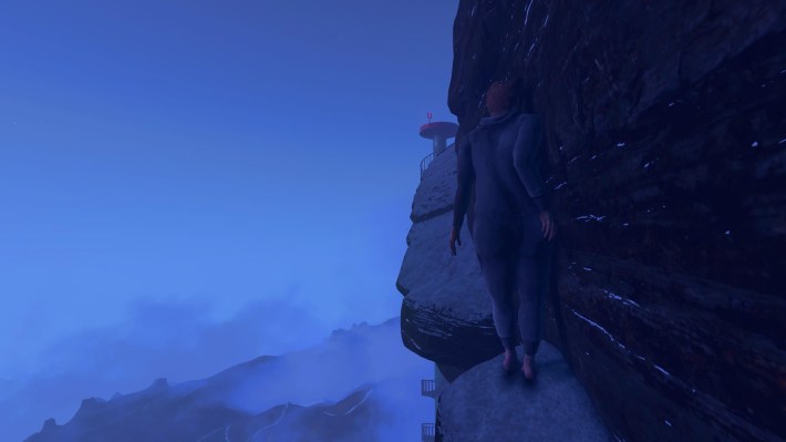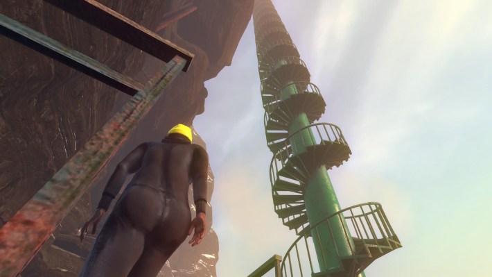 Narratively this is a beautiful setup. Baby Steps is ultimately a game about swallowing your pride and accepting help, but one that fills itself with many totally optional challenges. It can be a brutally difficult game, but it is often only as hard as you want it to be. Nate has fucked you here a little bit, because he is objectively in the wrong and should just take the stairs. But Jim is being a dick, something he has every right to be given Nate’s behavior. It’s not that I wanted Nate to win, I just had to know what happened if Nate actually pulled that off. So my long journey on the Manbreaker began.