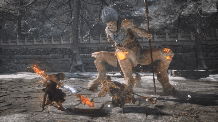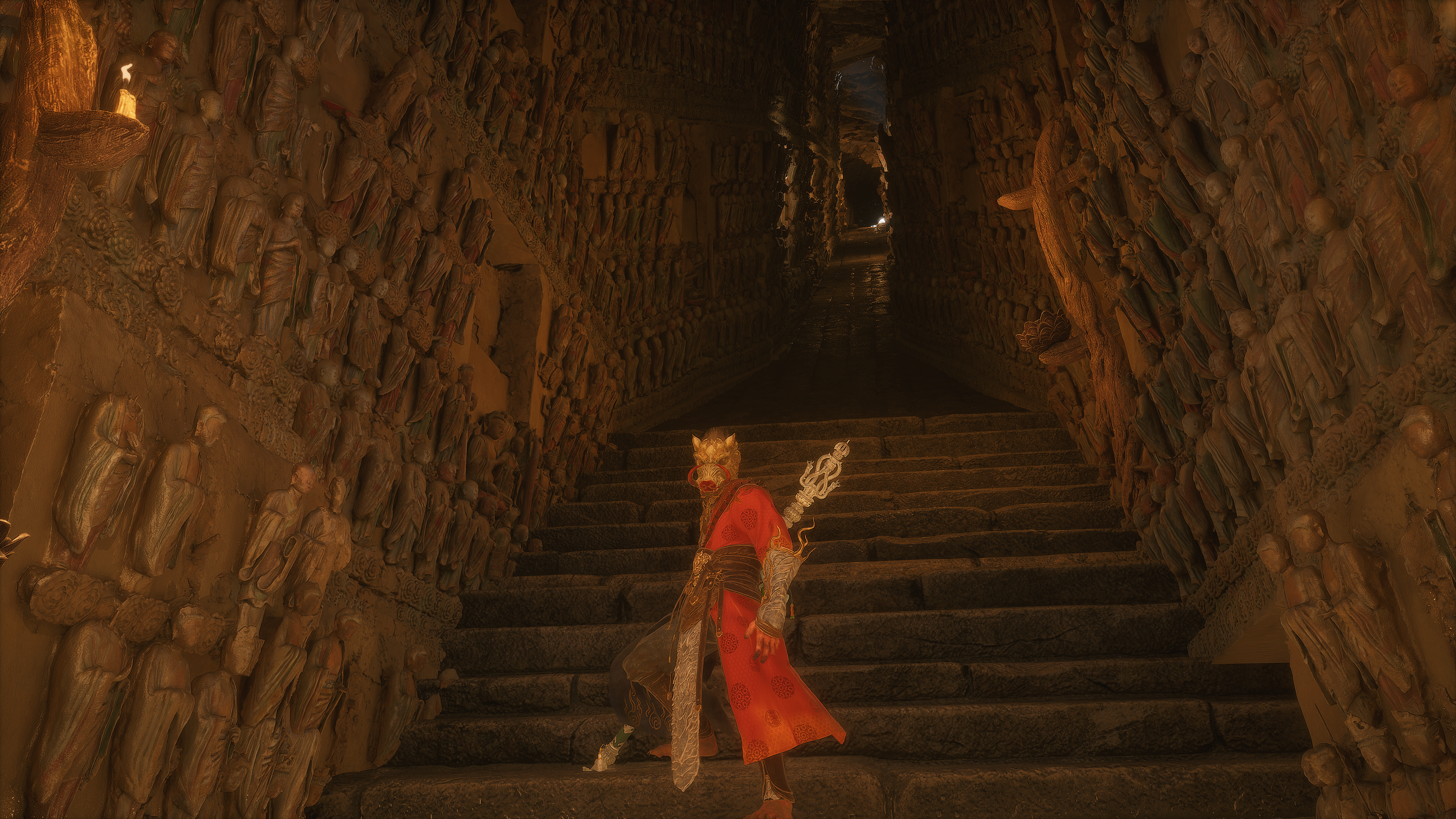 That Black Myth: Wukong does not stop to explain itself adds to the confidence of its execution. Of course you know who Sun Wukong and Zhu Bajie are! Everyone knows that. The game presumes you know Erlang Shen, Princess Iron Fan (Rakshasi), The Bull Demon King, and the demonic child Red Boy. Allusions are made to the shapeshifting bone demoness Baigujing. In the abstract you could argue that God of War does a similar trick, but the prior knowledge of the plot of Journey to the West is far more load bearing here. Wo Long: Fallen Dynasty also does something similar, but it is nowhere near to this level of scale, polish, or success, and it is helped in the West by Dynasty Warriors being a long-running franchise. Compounding this is the fact Black Myth: Wukong is not an adaptation but a sequel to Journey to the West. Save for the very beginning, you do not directly play as Sun Wukong but the “Destined One,” an entirely different monkey attempting to take up his mantle. That the Destined One is a taciturn, silent protagonist is a bit disappointing to me given that Sun Wukong’s whole deal is that he’s one of the biggest loudmouthed pricks in fiction, but this is ultimately a game that is attempting to comment on the story instead of telling it directly, which is the correct approach when limited to 6 chapters and 35-50 in-game hours. Many of the most successful movies about Journey to the West take the tack of either limiting the scope out of necessity or being loose with the source material (Stephen Chow has starred in, directed and written many of these), because you just don’t have the time to do it in a non-serialized format.
