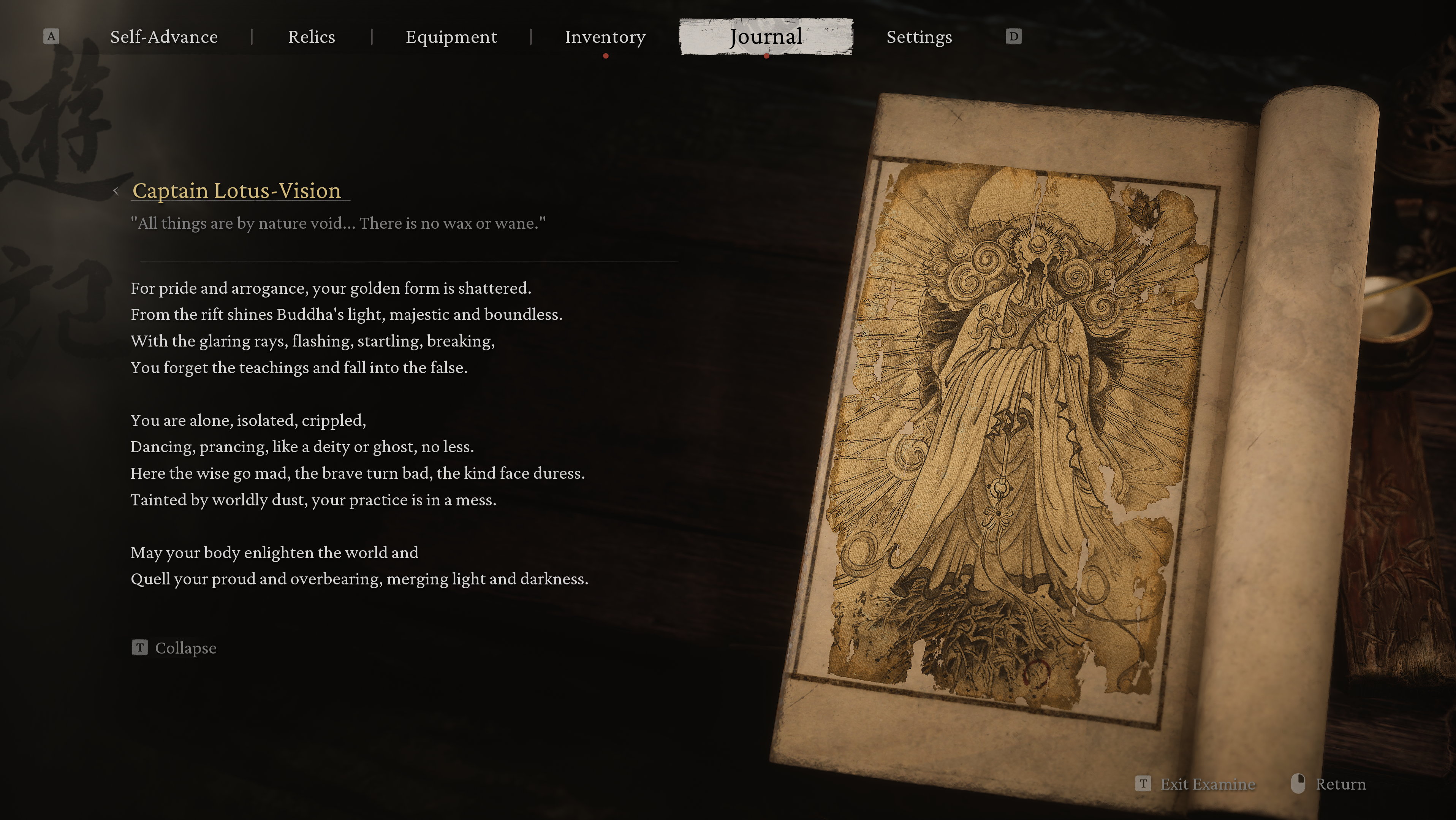 What really elevates the Black Myth: Wukong is the sheer density of it. Much of the production (although not polish) is on par with some of Sony’s best first party titles, but no part of it feels extraneous or watered down. You fight more than 100 bosses in the game, and a shocking percentage of them are not repeated. The ones that are repeated are done with good reason. Creatures and characters from the original novel are not only rendered and interpreted faithfully down to minute details, but every one of them has a dense, Final Fantasy XII style bestiary illustration and lore entry complete with poetry. Elaborate in-game animation and motion capture, fantastic voice acting, and wildly creative choices are around every corner. The headless sanxian player, played by Xiong Zhuying, is one of my favorite cameo characters in a long time. The elaborate anime segments between chapters, done by accomplished animators like Chengxi Huang and Hiromatsu Shuu, are jaw-dropping not only in their complexity, but in the way that they add to the backstory in a way that is parallel to the plot. Each one is unique, often animated in entirely different styles and mediums, with each feeling incredibly distinct. It’s like if you put an Animatrix-tier animation anthology in the middle of a Final Fantasy game. Even the way the game’s combat fuses existing gameplay conventions with new behaviors plucked right from Sun Wukong’s story is shockingly innovative. I can think of some games that do some of these things well, but none that do all of them well.