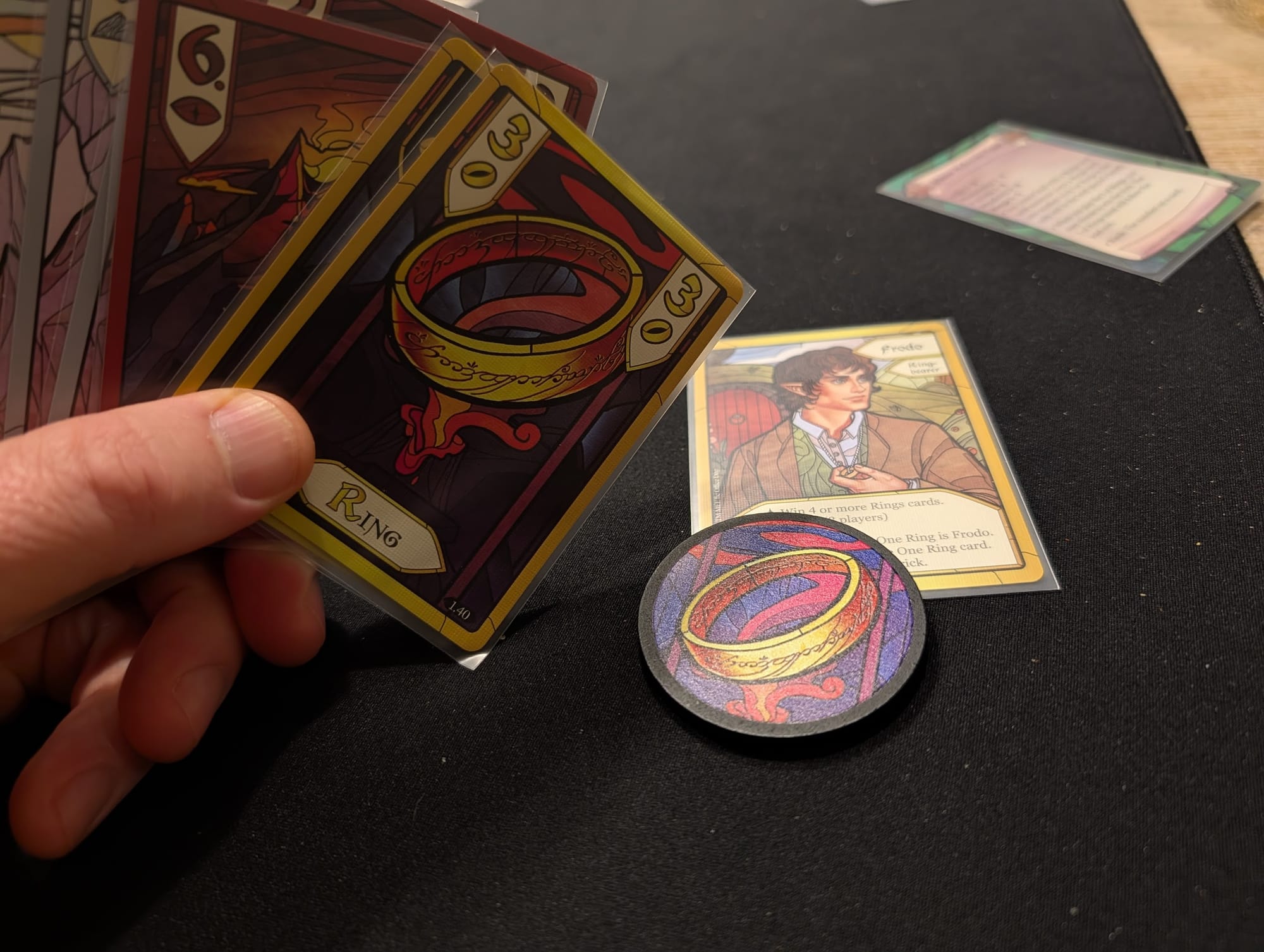 I played Courtisans, a game about intrigue and secrecy that might have the most beautiful cards I have ever held, or will ever hold. I played Lord Of The Rings: The Trick Game, which I hated every second of, but will remember forever because of how beautiful the artists made every hobbit.