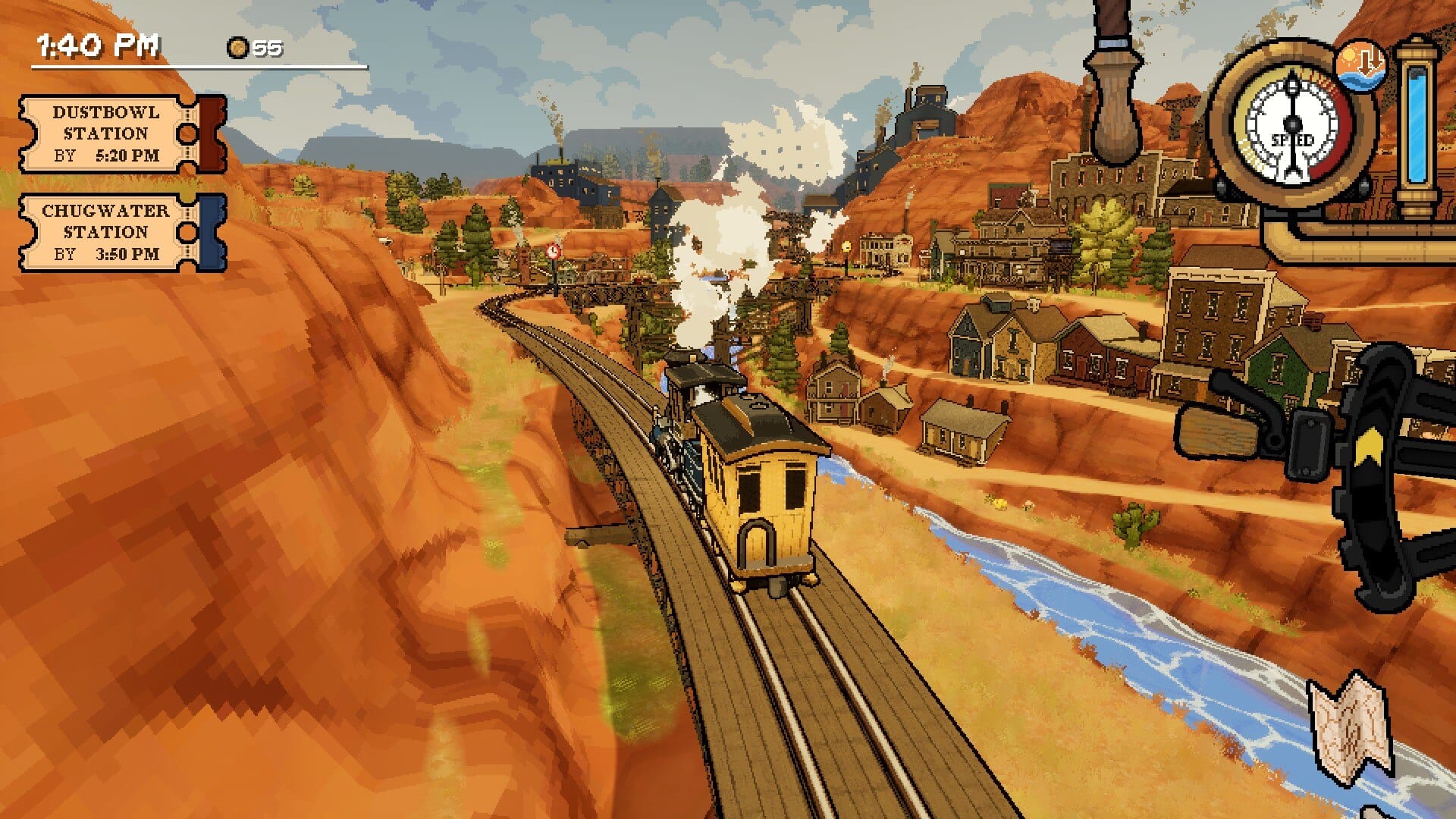 The tracks you follow are set into a sprawling desert landscape that, even rendered cartoonishly, really evokes a 19th century developing West. Wooden towns appear among the tumbleweeds and cacti, from little outposts of only a few houses to relatively sprawling metropolises set among cliffs or along rivers. Some paths in the demo are blocked off by boulders that the game says requires TNT to clear, and though you can’t do this in the demo I did enjoy rolling into a TNT depot and imagining chugging around with a bunch of dynamite. The weather changes, as does the time of day, with the sky becoming an endless expanse of stars that reminded me of being alone in the wilderness in Red Dead Redemption.