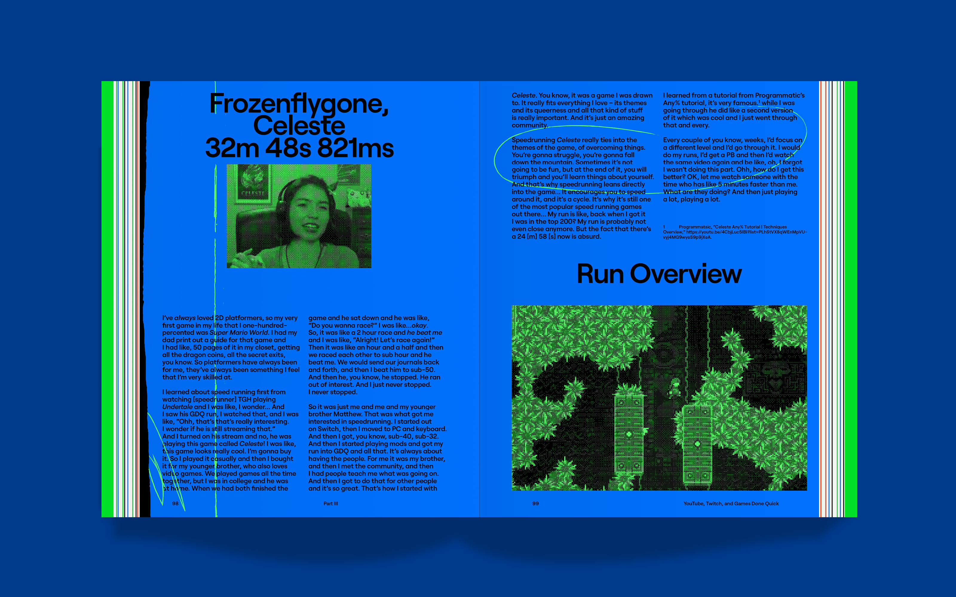 So it was just me and me and my younger brother Matthew. That was what got me interested in speedrunning. I started out on Switch, then I moved to PC and keyboard. And then I got, you know, sub-40, sub-32. And then I started playing mods and got my run into GDQ and all that. It’s always about having the people. For me it was my brother, and then I met the community, and then I had people teach me what was going on. And then I got to do that for other people and it’s so great. That’s how I started with Celeste. You know, it was a game I was drawn to. It really fits everything I love – its themes and its queerness and all that kind of stuff is really important. And it’s just an amazing community.
