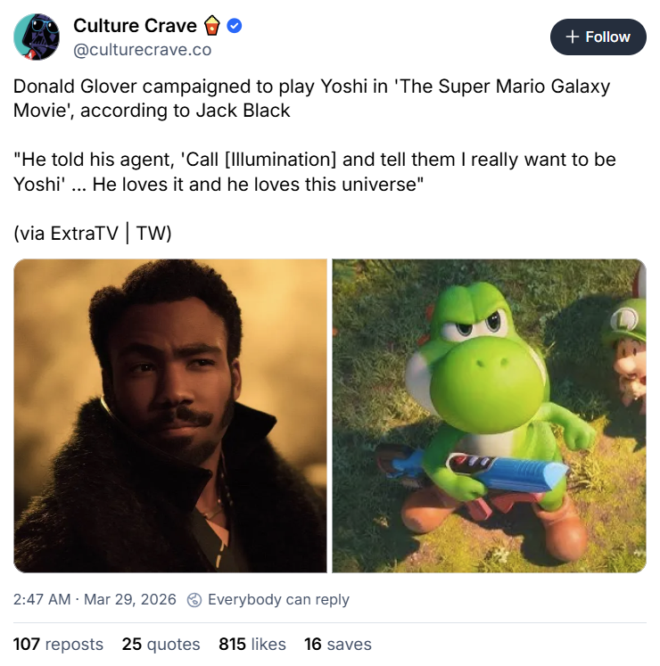 Here's an example: this post, about Donald Glover and the Super Mario Galaxy movie, credits Extra with a "via" then does not link the outlet in either this or a follow-up post. Culture Crave have simply taken news that Extra generated from an interview with Jack Black and Anya Taylor-Joy and lifted it wholesale, getting thousands of likes on Twitter in the process (you can see Extra's original interview here).