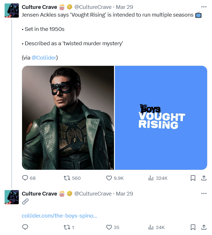 Here's another example of Culture Crave fuckery: of these two posts below, about yet another spinoff series based on The Boys, the top post--the one with the news and thousands of likes--does not link Collider's story that obtained the information, even though it very easily could have. The second post, the one with...35 likes, does.