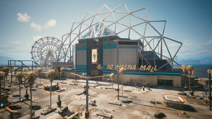 In Night City there is one purpose: play. Industrial areas are open to the player, and often the site of a shootout or stealthy break-in. The surveillance cameras are tools to be hacked and turned upon their owners. The commute is immaterial: driving is fun in Night City. Traffic has been massaged into an entertaining obstacle to swerve around, and if you screw up and crash your car it’s no big deal.