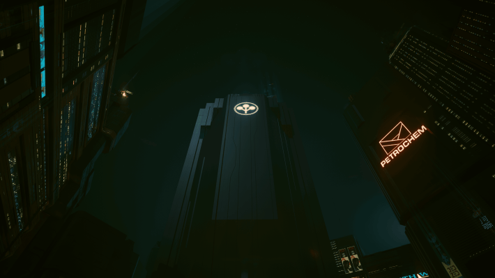 The first time I get a good view of Cyberpunk 2077’s Night City is from the window of a private taxi. The driverless flying car departs from a portal high up in the side of my corporate employer’s headquarters and soars over a packed, four lane traffic circle. I sip champagne as neon towers slide past, megabuildings whose gargantuan size would make Denis Villeneuve blush.