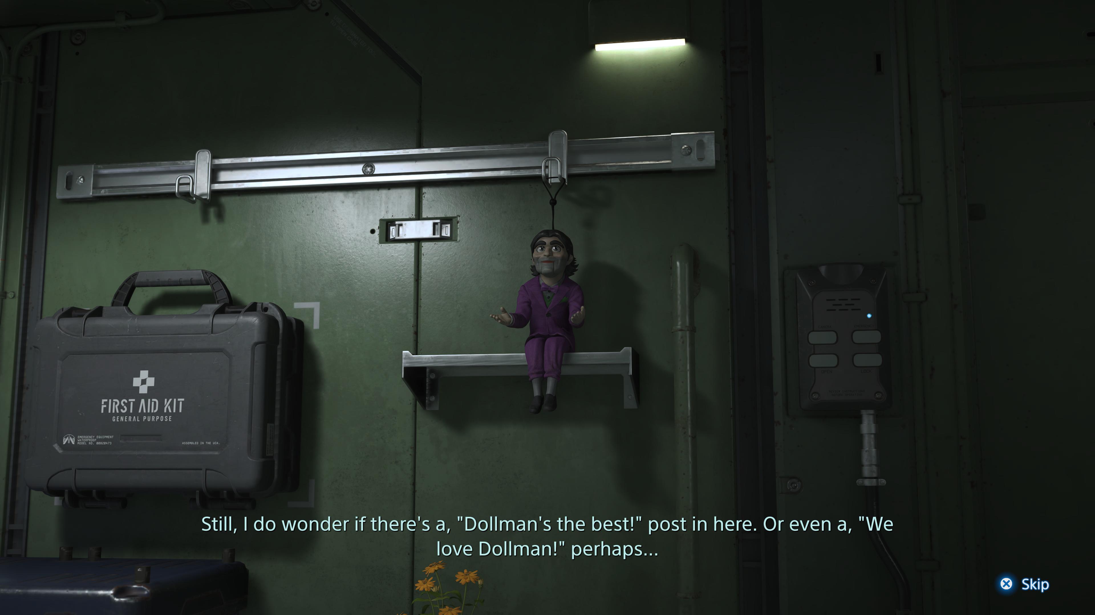 Of all the new cast members, the one you interact with the most is Dollman. Dollman is a guy whose Ka, or soul, was trapped inside a doll. His body moves in a troubling, jerky way which makes him appear as though he is animated via stop motion. He also serves the same purpose that codex calls in previous Kojima games; a means to keep the player on track with the most obnoxious and obvious exposition humanly possible.