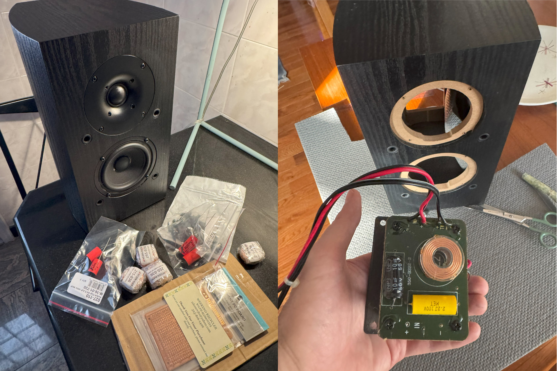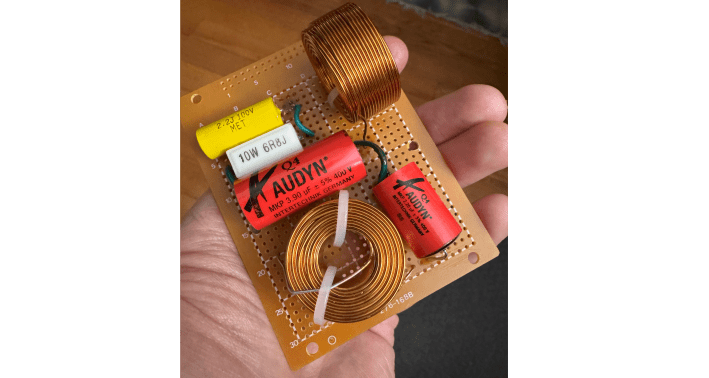 From here, you have to solder the correct components and wires to the board to create the required circuit. Holes have to be drilled into the perf board at specific locations to not only mount the crossover, but provide spaces for zip ties to go to secure the heavy copper air cores to the board. Once this is done, the original PCB and the new one are sandwiched and soldered together, separated by nylon spacers. The parts are gluegunned to the board to make them more stable, the wires are reconnected at the right points, and the new board is screwed together. The drivers and crossover are returned to the newly padded cabinet with more durable wood screws. Everything else is tightened up and connected. Repeat this process for the number of speakers you are making.