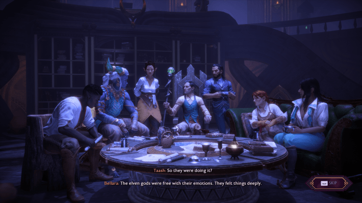 In response to one memory, your party gathers to discuss the theological implications of what they’ve witnessed. Emmerich remarks that, if true, this memory of Solas’ might disprove the entire Chant of Light. And Rook? Well, they can respond with some variant on “whoa, that’s crazy.” And then it’s never brought up again.