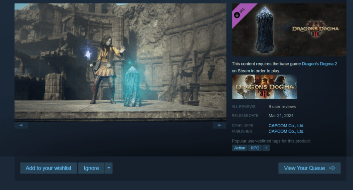 Dragon’s Dogma 2 is out now. I have been playing it quite a lot, and really loving it. It is also currently being review-bombed on Steam, for general performance issues and Denuvo (valid!), the inability to restart your game easily (also valid!), and for single payer microtransactions for items. While I conceptually agree with that last criticism, I think the entire conversation has happened in a way that’s funny, largely misinformed, and does a disservice to the game itself.