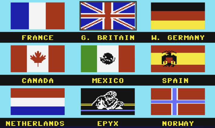 There is of course no such country as Epyx; that's the name of the studio responsible for the game, as well as a succession of other 1980's classics like Barbarian and California Games. In hindsight, it's pretty funny Epyx put themselves into the game to such an extent. But I didn't know that at the time, and so almost as often as I'd choose a real country I'd choose Epyx, because damn, their flag looked amazing.