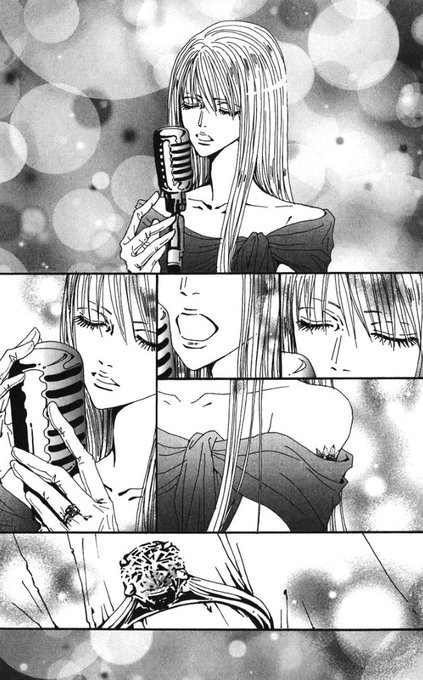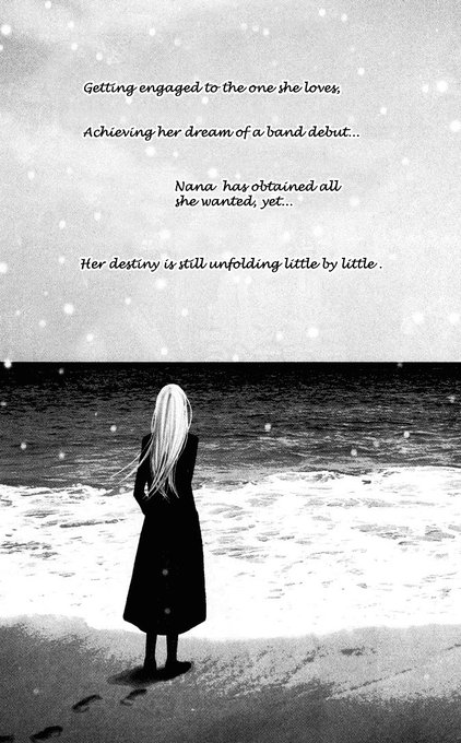 To me that's the entire journey Nana goes on after Ren dies in a car crash after doing drugs and rushing to get her a present for her 21st birthday. She's still got her looks (a new one, in fact) and her passion for music after disappearing herself. But a lot of her final shots in the manga are giving the ending of Kate Chopin's The Awakening rather than a cathartic feeling that gives hope that she and her best friend Hachi will ever meet again. If anything, her staring at the ocean reads that she ran away, on her own once again, to try to slowly ebb herself into the ocean, or at least teach herself to. The pain of continuing on with her bandmates after something she thought impossible finally came to pass made her just run away. She can maintain her own self-hatred and self-loathing, but having those thoughts superseded by a refrain asking what Ren took and what he took from her to die in such a tragic fashion broke her. Translation: I like making myself sad.