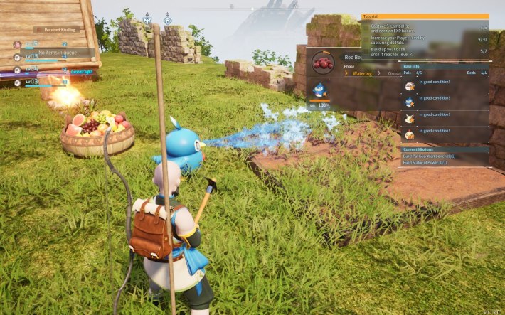 Initially, you fight Pals yourself using crafted items like a club, a bow, and a spear, and then, once they’re weak enough, you capture them with a “Pal Sphere,” which is so close to the word “Pokeball” that I have to admire the audacity. Once a Pal has joined your team, you can redeploy them – one at a time – into the field to fight alongside you, or, more usefully, you can put them to work at your base. At first, this is kind of sweet: You begin bonking together a ramshackle shield at a crafting table, and then a Pal totters over and puts its tiny hands to the task as well. When you’re finished, it whoops in glee.