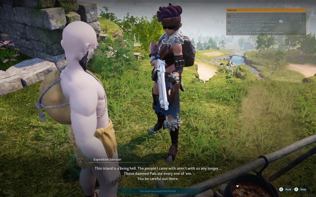 That said, I have had guns used against me! The first time was entirely my fault: There’s a tutorial NPC near where you start the game who offers advice and a couple free items, and I wanted to see if the game would live up to its grim, no-holds-barred reputation enough to let me attack him. It did! I stabbed him with a spear until he fell off a cliff. Then the game alerted me that I had committed a crime and sent two machine-gun-toting, level-24 NPCs after me (I was level 6 at the time). They chased me to my base, and I thought they were gonna slaughter my Pals alongside me, which would have been exceptionally dark. Fortunately, I was able to lose them or glitch them out of existence or something by climbing into my bed and just lying there for a while. Crisis averted.