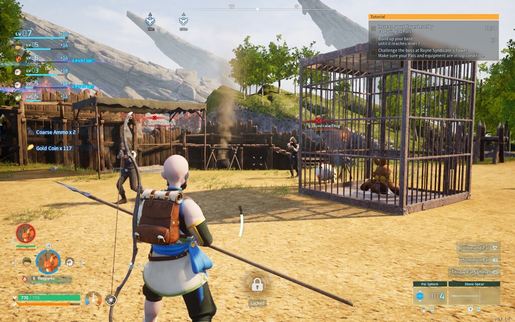 A little later, while exploring, I came across a base full of poachers who’d caged a rabbit Pal and, in so doing, pissed off the local wildlife. They opened fire while creatures charged and swooped at them from land and sky. With the chaos muffling my footsteps, I snuck in and freed the rabbit Pal from its cage. Then I poked the remaining, thoroughly distracted poachers to death with my spear. It was a cool moment, but I couldn’t help but feel the way I imagine the Pals who work for me feel all the time: I wanted a gun.