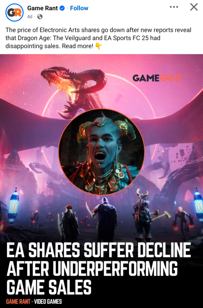 Game Rant's actual news story about this, on its website, makes this clear. And the lead image for that story on Gamerant.com is EA's logo. Yet on this Facebook post promoting that same story Dragon Age is mentioned before EAFC, Dragon Age is used as the background of the image, and front and centre is a picture of a Dragon Age character. What gives?