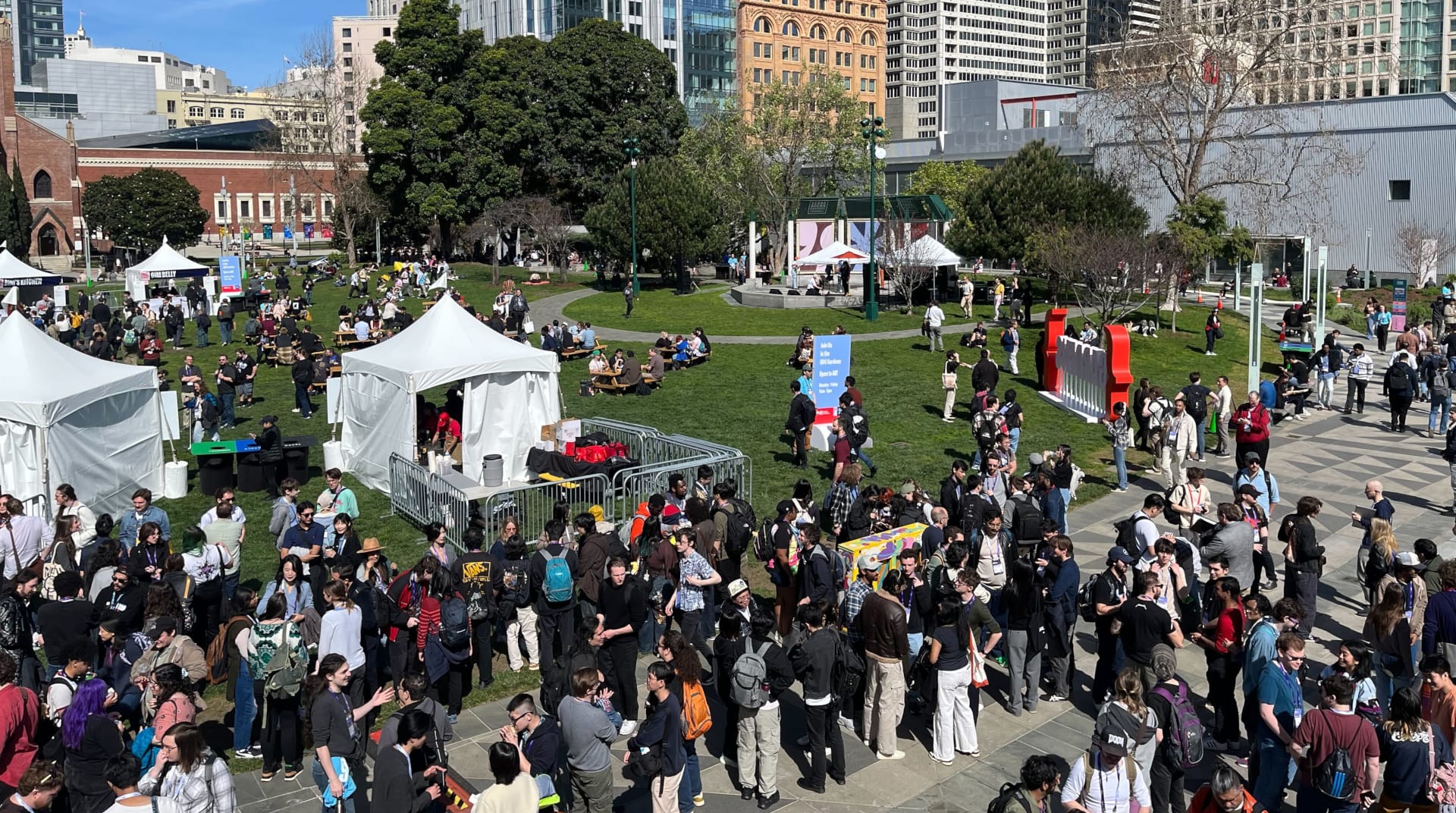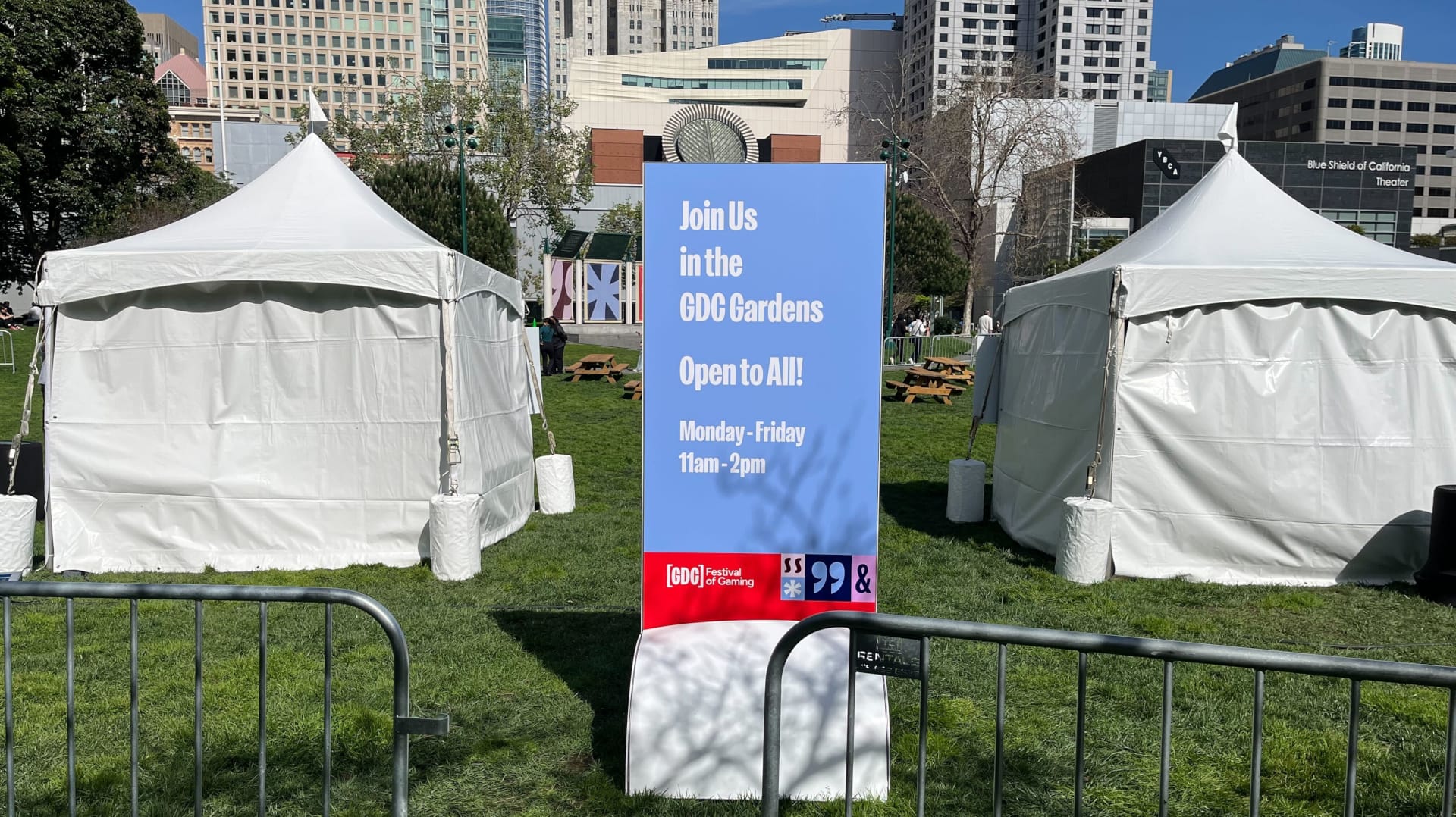 Moscone, the largest convention center in the city, houses much of GDC. But the conference — like many others — spills out into numerous nearby venues and locales, of which the nearby Yerba Buena Gardens make the most intuitive sense. The Gardens might as well be part of the Moscone Center, given their proximity, and if the weather’s nice, the manicured lawn and cool air serve as a needed reprieve from stuffy, artificially lit halls. Whether for breakfast, lunch, or to network into all hours of the evening, developers have treated the Gardens as a flashpoint for well over a decade. This year, throughout large portions of the day, there are some new additions: tents, benches, and a fence.