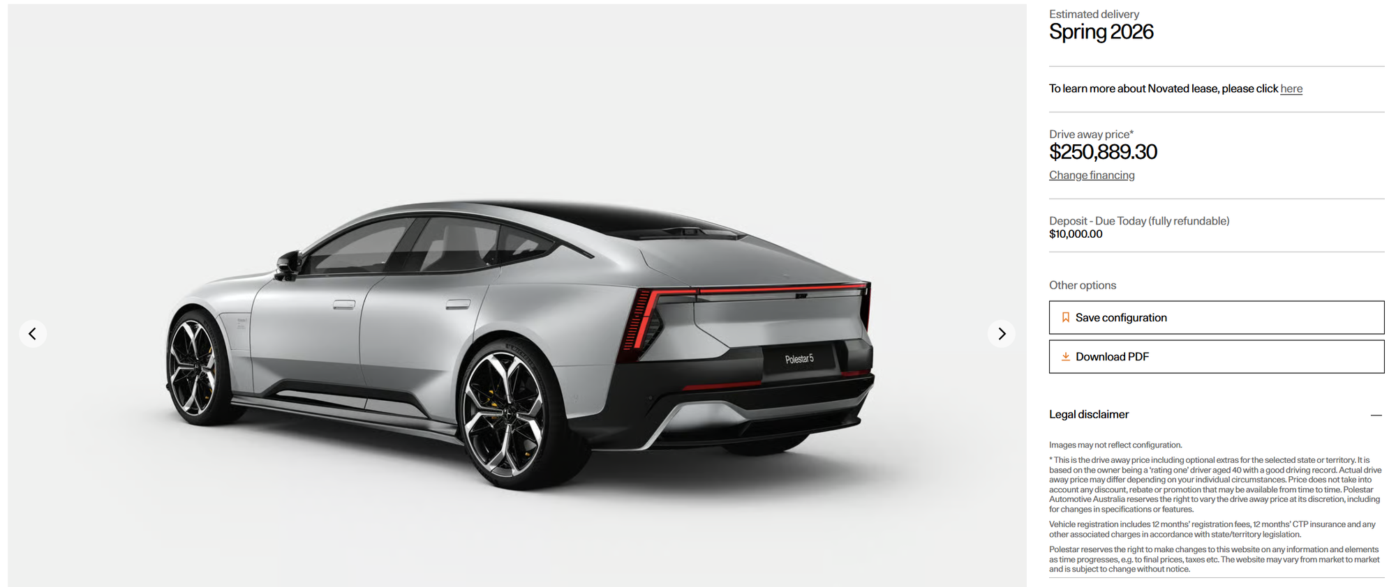 Why now? This game came out in 2020! Well, I'm not ashamed to say that while I am an enemy of brands and the idea of loving brands, I have one glaring and fatal exception: the electric car manufacturer Polestar. I'm very into the company's focus on both design and sustainability. I own a Polestar 2 and it's incredible, but I want a Polestar 5 more than I have ever wanted a car in my life. Thing is, it's priced at roughly AUD$250,000 (see above), so it's a car I'll likely never get to even drive, let alone park in my garage. So the closest I'll probably ever get is driving one in a mostly-realistic driving video game, where it recently arrived as part of an update that doubled as a marketing exercise for Polestar (see below). A cheap and obvious marketing trick, but they got me.