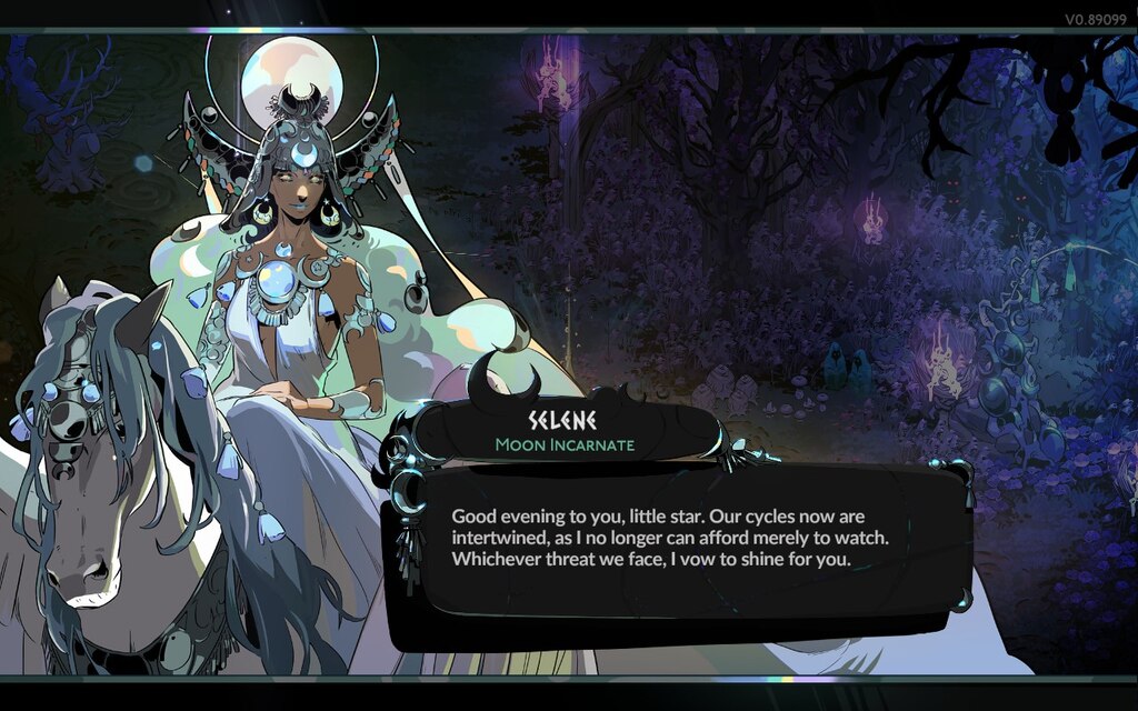 Chris: Speaking of mechanics, the Selene mechanic is really interesting. Melinoë is more moon-adjacent and so Selene's upgrades are like, independent of the boon tree and are closer to an ult that activates when you spend a certain amount of magic.