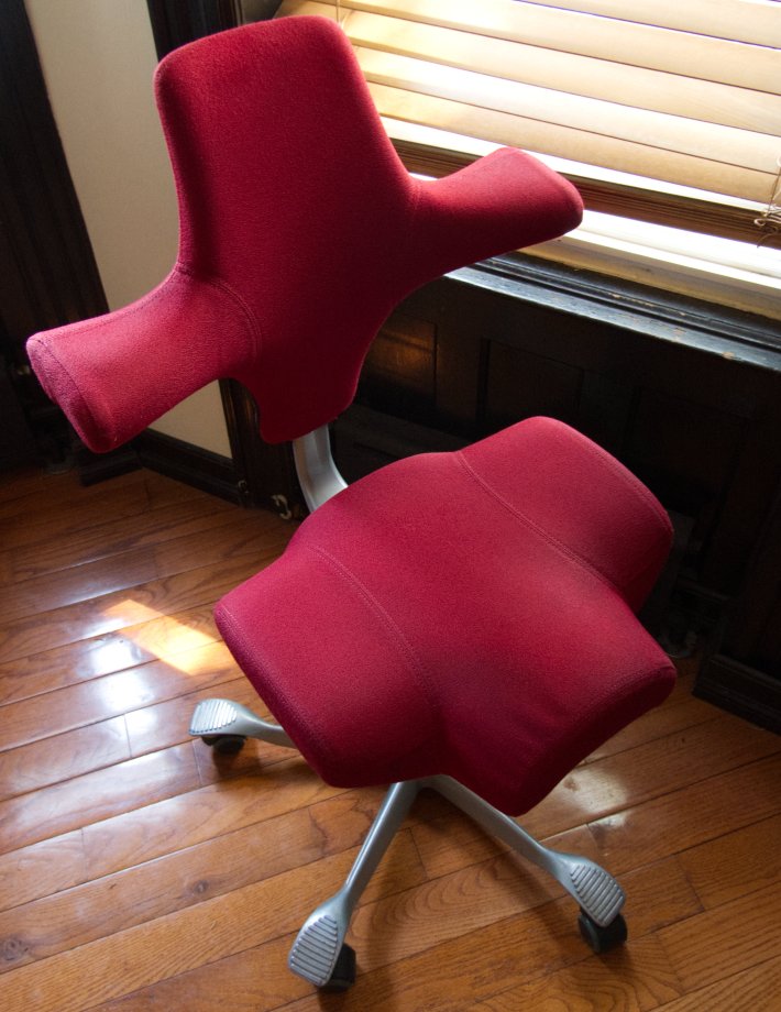 I own two Capiscos. The best-known model is the HÅG Capisco 8106, but my first was a “Puls” model I got cheap on Craigslist from a startup guy in Tribeca who got it with a Covid stipend and said his “wife hates it.” The Puls is a budget friendly version that swaps much of the fabric back out for rigid, injection-molded plastic. This is far more useful if you are in a medical environment or someplace where you may easily stain the fabric, but some people may just enjoy the feeling of rigid plastic on their skin. I do not, and for that reason the chair is now on semi-permanent loan to my local hacking space. But the Puls gave me a taste for the real thing. and I have been quietly searching Facebook Marketplace for an 8106 ever since. This week, I found someone who had one sitting in storage and on a severe discount because it needs replacement foam on the seat. After a long and complex ride via public transit (it was raining and no cabs were available), my baby was home.