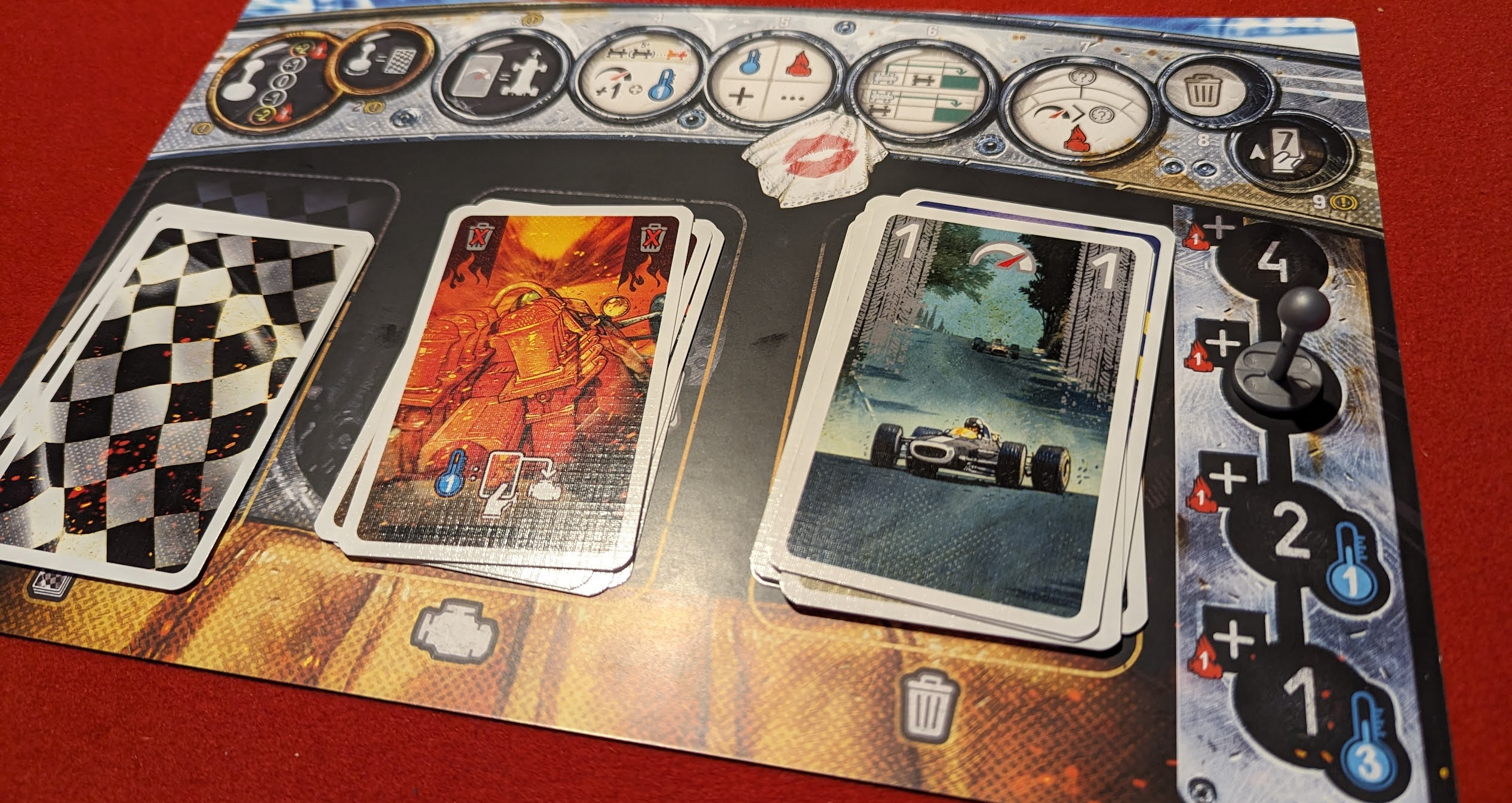 That was pretty much how Flamme Rouge played, but here, driving big explosive cars instead of just pushing a bike up a hill, things are a bit more complex. The game's name comes from the heat your engine generates, which is something players have to juggle throughout the game; pushing your car will move you faster and get you out front, but the more you push, the more heat you'll generate, and if your car gets too hot, you'll spin out.