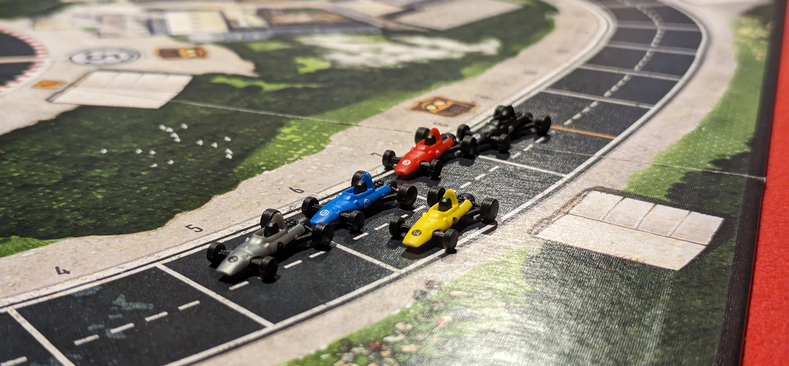 The one racing game that a lot of people thought was really good is 2016's Flamme Rouge (which I reviewed at The Old Site), and hey whaddya know, it was designed by Asger Harding Granerud, the same guy behind Heat. Only now instead of riding bikes around an old-timey Tour De France, we're driving cars around an old-timey Formula 1 circuit.