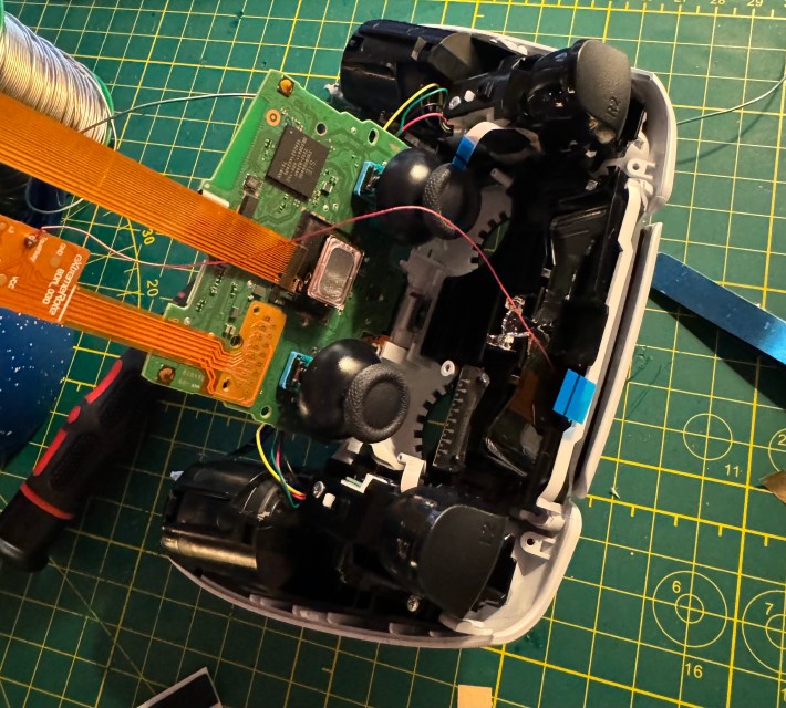 Pulling this kit off is not difficult*, but I say that as someone who regularly makes keyboards from scratch so maybe I am not a trustworthy narrator. If you can handle an advanced Lego kit you could probably do the basic version of this with only a little trouble. You simply disassemble it, unplug the ribbon cables when you need to, keep all your parts in the appropriate areas, add your mods in there, and then put it all back together with a new shell, threading a flexible PCB into the weirdly alien-looking rear paddle array. If everything goes off without a hitch, you should be able to check using an LED light at the top of the weird alien fin you have now affixed to your game controller.