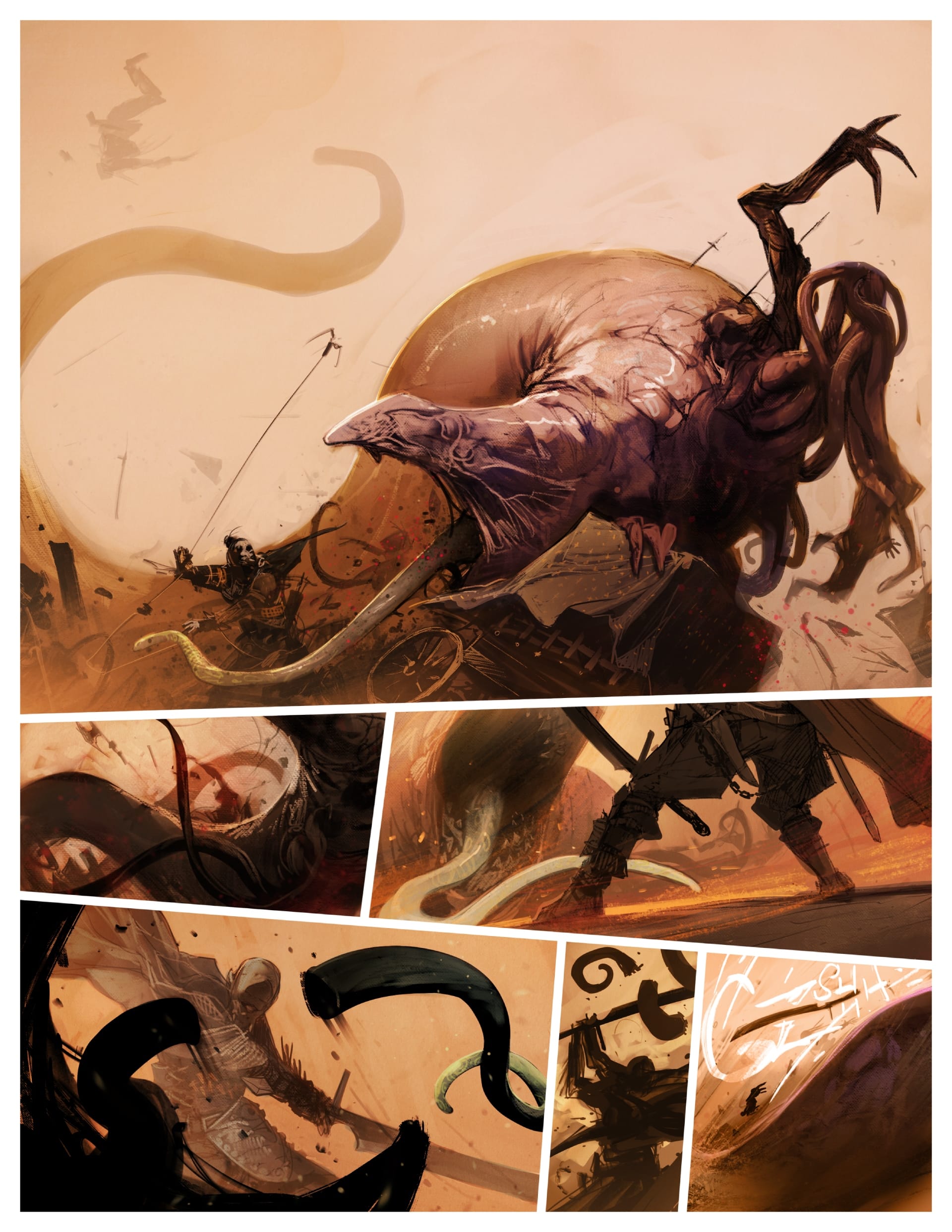 What really gets the genie out of the bottle with I Roved Out is Flower’s work ethic. Witnessing him drop chapters in real time, displaying Yusuke Murata's levels of “lemme tweak this page even though it's already perfect,” feels like a crime. Flower’s updates don’t just add small fixes to pages; they refine what’s already there and then some. And he brings that same artistic intensity to depicting a wide range of bodies and creatures, giving each one personality, presence, and physical specificity. Nothing feels generic in the pages of I Roved Out. Everything feels intentional and downright bespoke.