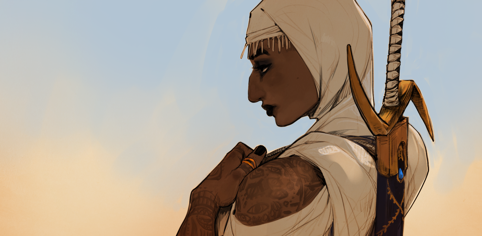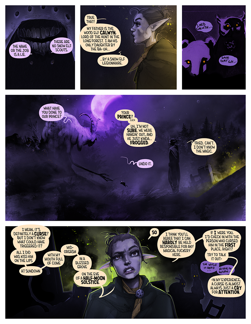 In tow is her situationship, Maeryll, a snow-elf assassin who is essentially everything Cinder is not. Where Cinder is a speak-her-mind, down-to-earth type of gal, Maeryll is… well, that but in a femme, ice queen package. She’s basically the elegant, composed image you’d have of a fantasy elf that isn’t interested in you. That’s probably because she has her own issues, like a cursed rune that makes her eyes glow like a sky beam whenever she has orgasms—which you can bet your bottom dollar becomes a long-running side quest for the disaster bisexual ranger and her posh lesbian assassin friend to put in the elbow grease to remove.