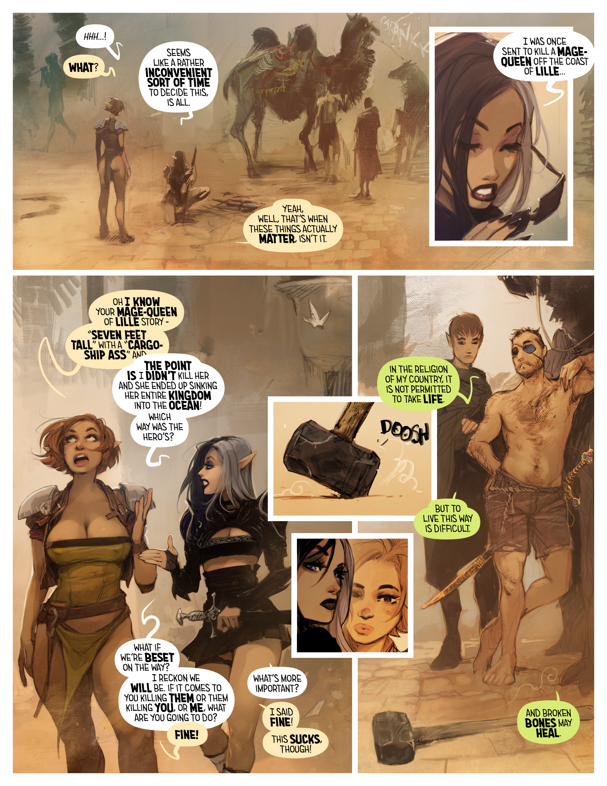 Dialogue in I Roved Out snaps with a self-aware wit that knows exactly what kind of story it’s in. Sure, you can breeze through its sultry pages and have a blast, but the real reward comes when you catch all the double entendres, grandiose fantasy jargon, and character reactions you missed in the background of its busy panels. It’s a comic that playfully winks at you while also delivering the goods in spades.