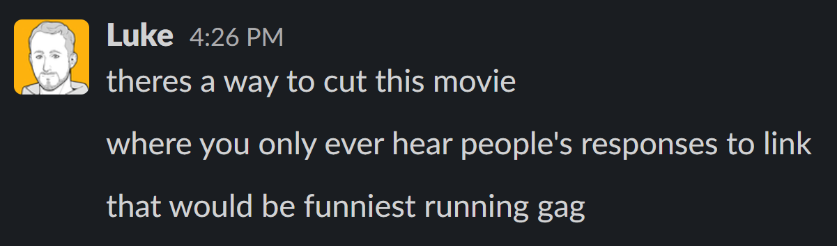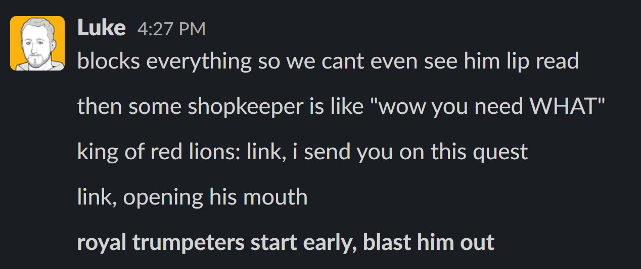 If the creatives behind the Zelda movie want, they could easily make Link canonically unable to speak or have him communicate via sign language or something to that effect, a unique and potentially interesting spin on the character. Failing that, Aftermath’s own Luke Plunkett – who once wrote an outline for a Zelda movie and even created art for it, but who somehow does not believe there’s a blog in that – has some suggestions as to how Link could never speak to the audience while still talking to other characters: