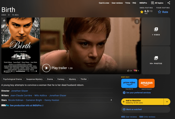 This theory was inspired by Jonathan Glazer’s movie Birth. Birth is a downright bizarre and abrasive movie that makes strong choices. It’s a haunting psychological drama about Nicole Kidman being convinced by a child that he’s the reincarnation of her husband who died of a heart attack in Central Park. Criterion just announced a 4k Blu-ray of it. There is simply no movie like it, and it is currently sitting at 6.3 on IMDb. Under The Skin, Glazer’s harrowing sci-fi adaptation about an alien luring Scottish men to its lair in a Scarlett Johansson skin suit, also stands at 6.3. In fact, Sexy Beast and The Zone of Interest, by far Glazer’s most critically acclaimed works, top out at 7.3.