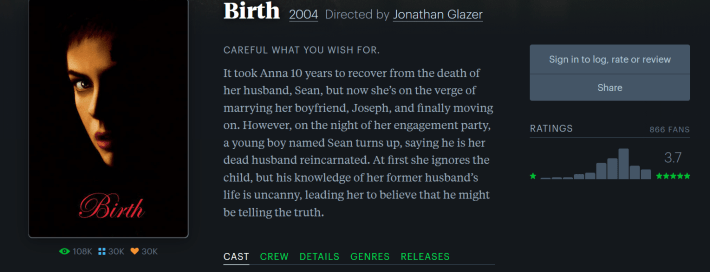 This theory was inspired by Jonathan Glazer’s movie Birth. Birth is a downright bizarre and abrasive movie that makes strong choices. It’s a haunting psychological drama about Nicole Kidman being convinced by a child that he’s the reincarnation of her husband who died of a heart attack in Central Park. Criterion just announced a 4k Blu-ray of it. There is simply no movie like it, and it is currently sitting at 6.3 on IMDb. Under The Skin, Glazer’s harrowing sci-fi adaptation about an alien luring Scottish men to its lair in a Scarlett Johansson skin suit, also stands at 6.3. In fact, Sexy Beast and The Zone of Interest, by far Glazer’s most critically acclaimed works, top out at 7.3.