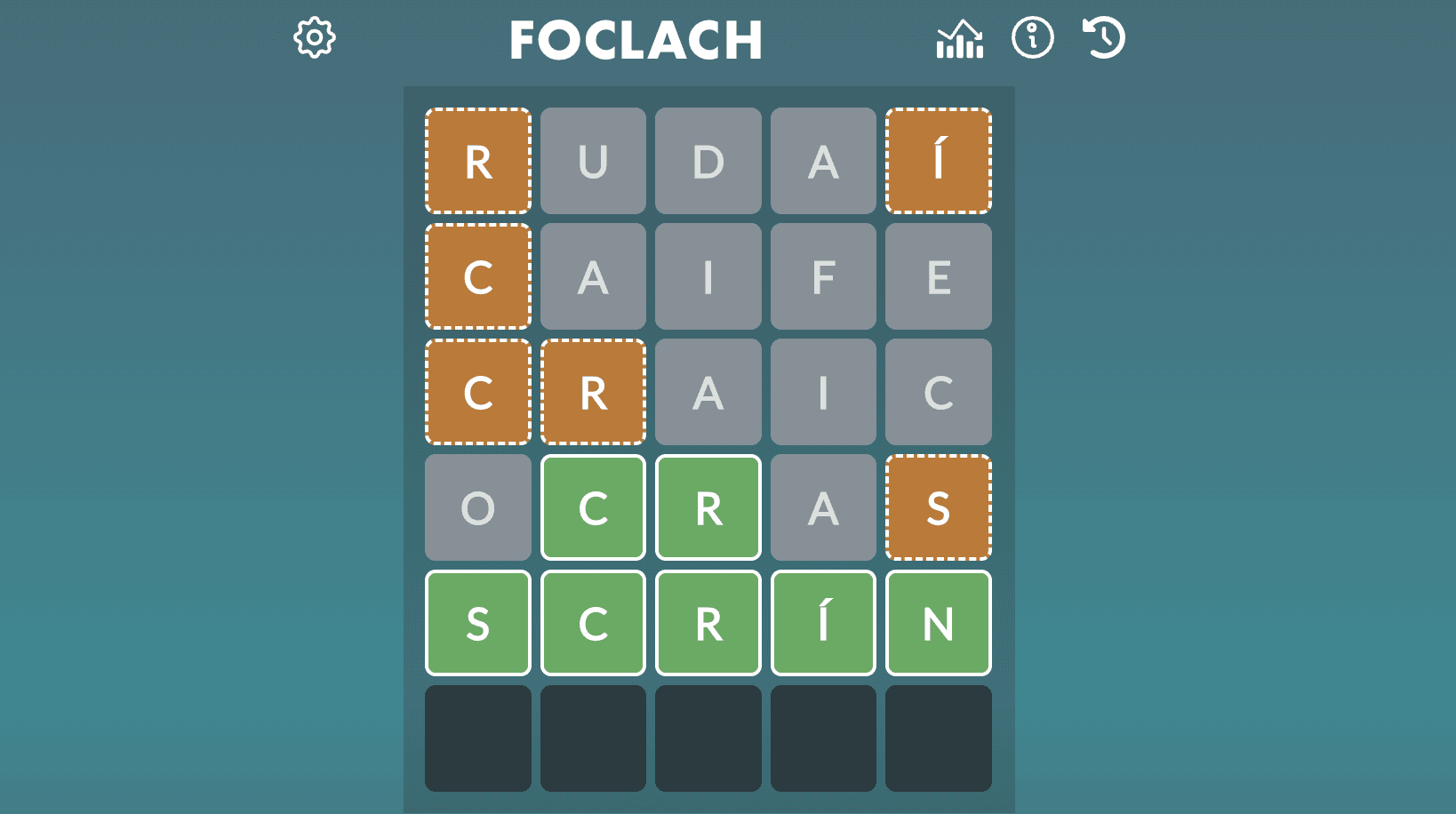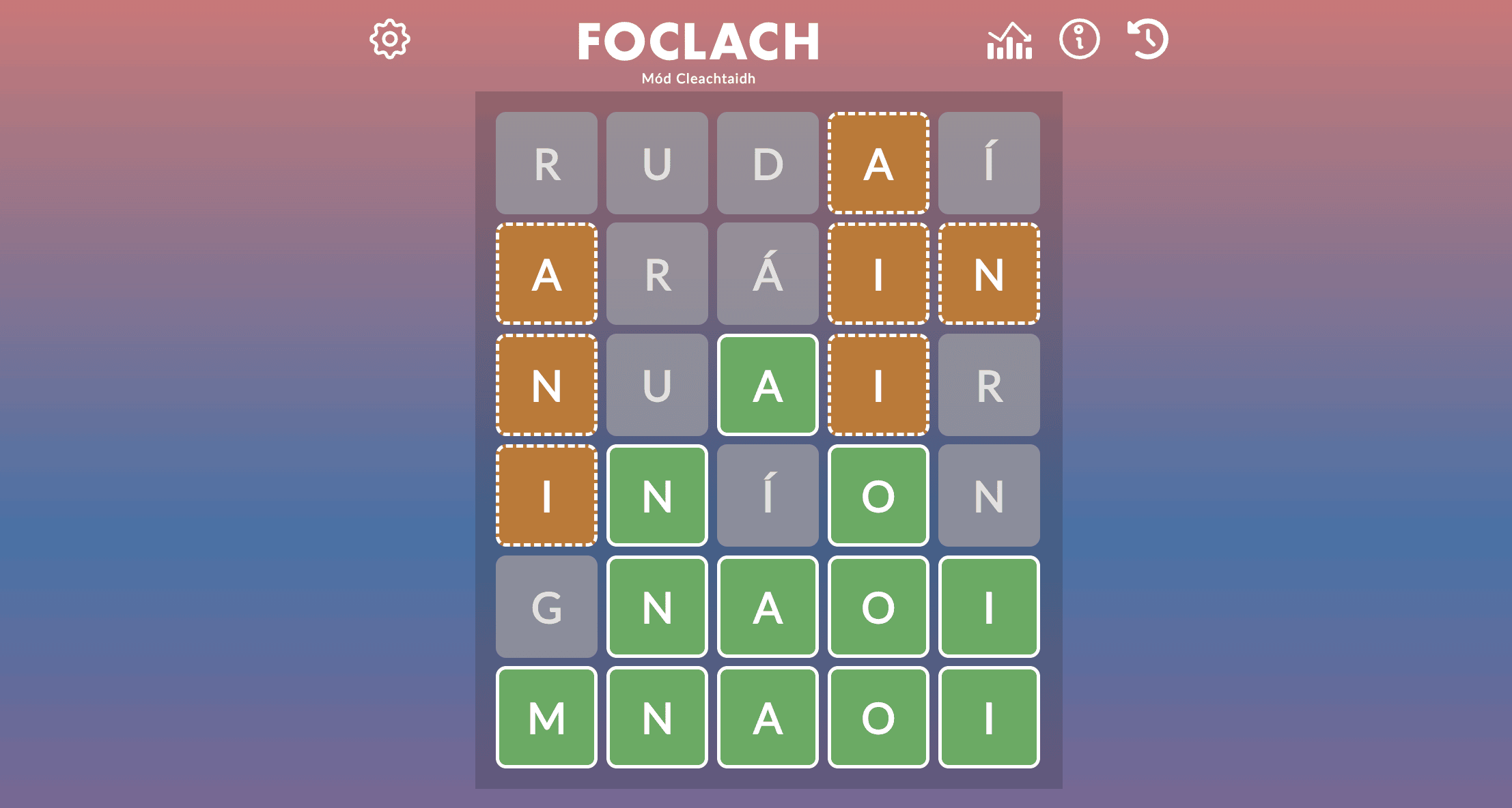 So I was shocked when I got Tuesday's daily puzzle on my fifth of six tries, relying solely on my own knowledge of Irish. (Spoilers ahead if you're going to play it yourself.) I feel like it's key to start off with a good first guess in games like this, so I decided to go with "rudaÃ" ("things") because it contains a variety of vowels, including a fada, or accent mark. (Fada add another complication to Foclach; there are some words that are spelled the same but mean different things depending on the fada.) I definitely wasn't as economical with my guesses as I am in English, using letters I knew weren't in the answer because they were in words I knew. But I managed to get close enough to make an educated guess at the last letter, and was pumped when I got it right.