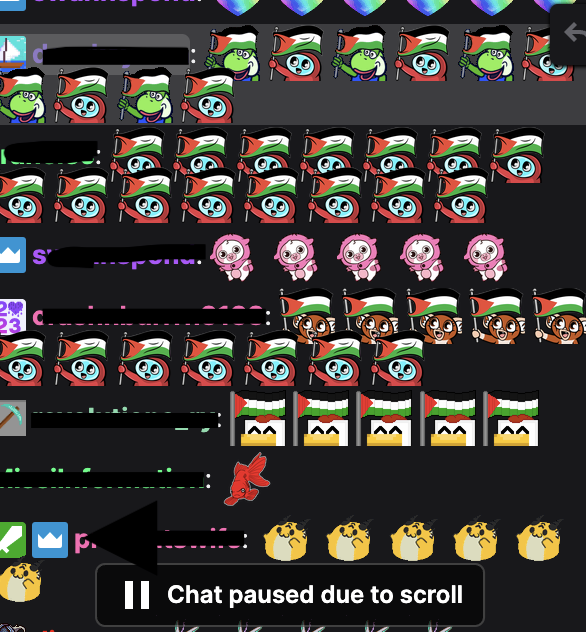 During the broadcast, chat was largely in emote-only mode, with many seemingly intended to express enthusiasm (hearts, raised hands, signs that read ‘yea,’ etc). These were sporadically broken up by floods of Palestinian flags, as well as images of letters that spelled out “Free Palestine.”