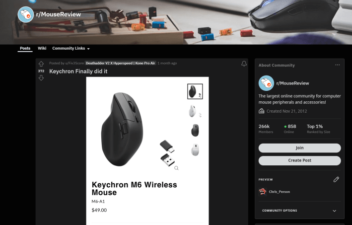 This brings us to Keychron as a company. Keychron makes ‘fine’ products. I would not say they are uniformly great, as the build quality on their lower end models will sometimes leave a little bit to be desired, but where they shine is features. If you want a Bluetooth keyboard with hot swappable switches that runs open source firmware, Keychron is your cheapest entrypoint that isn’t DIY. And over the years they have proven themselves more willing to listen to consumer feedback and adapt faster than other companies. I like to see a company that is hungry, wants to win, and is willing to listen to freaks like me. I immediately bought the mouse and posted about it when I had the chance.