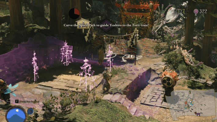 During the day you use crystals (Guess what? They’re Orbs!) to push Yoshiro forward, undo corruption, unlock collectibles and items, prepare fortifications, and strategize for night time. Every night a new wave of Seethe emerges from the Torii gates, and you must survive the onslaught. Soh acts as both a commander and a soldier, and in addition to the regular stages there are also boss battles, which switch the dynamic from linear, lane-based tower defense mode to big area fights.