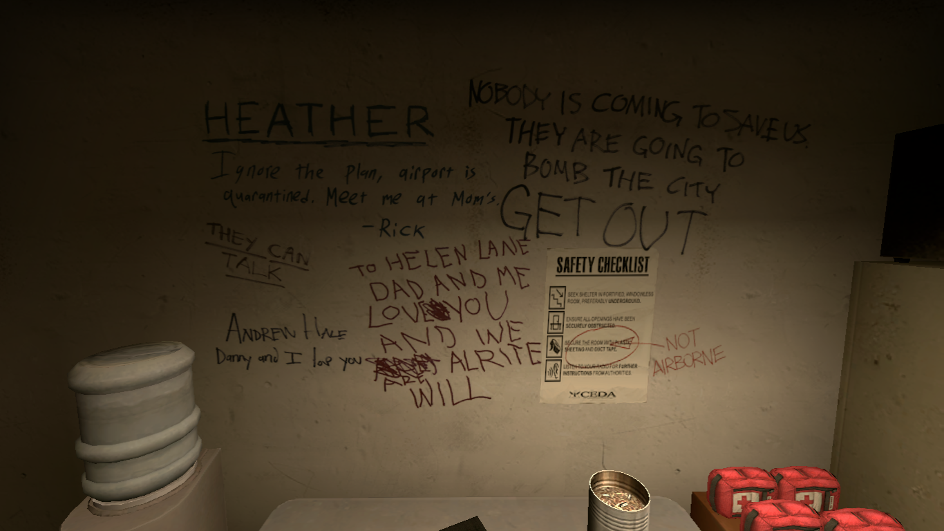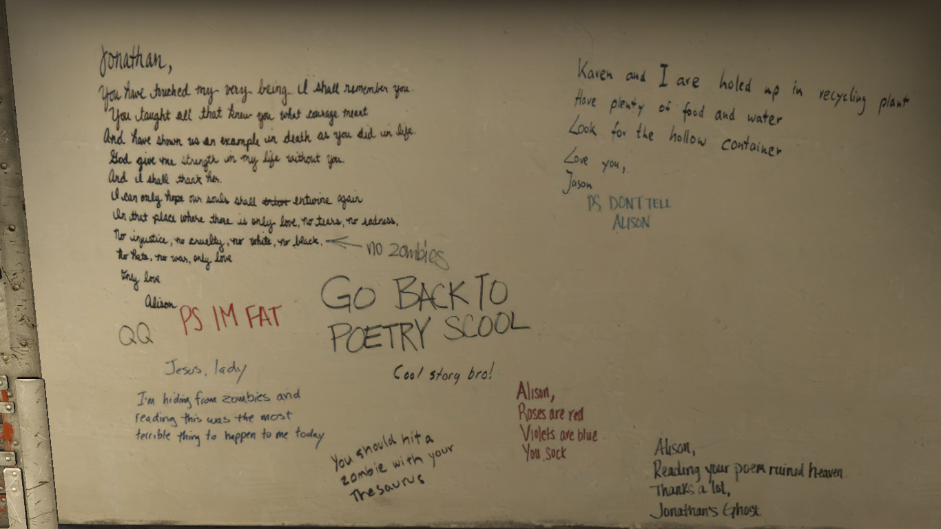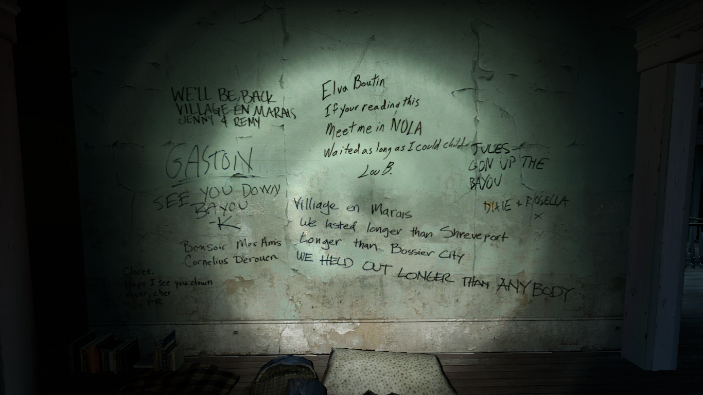 "My memory of the Left 4 Dead graffiti is that it was an early attempt at crowdsourcing," Pinkerton told Aftermath. "I remember we covered several walls of the office in butcher paper and laid out dozens of markers, pencils and pens, and we invited literally anyone who happened to be walking past to contribute. If they weren't feeling creative, we let them flip through a big script book of things we'd pre-written and let them pick one that felt right to them, and encouraged them to rewrite it in whatever style they liked. If people wanted to go off script, that was also fine. We tried to reinforce that this shouldn't be taken lightly, obviously, they should picture themselves in a tight situation with maybe only a few moments to write something on a wall quickly that a loved one might see. But otherwise we offered very little oversight."