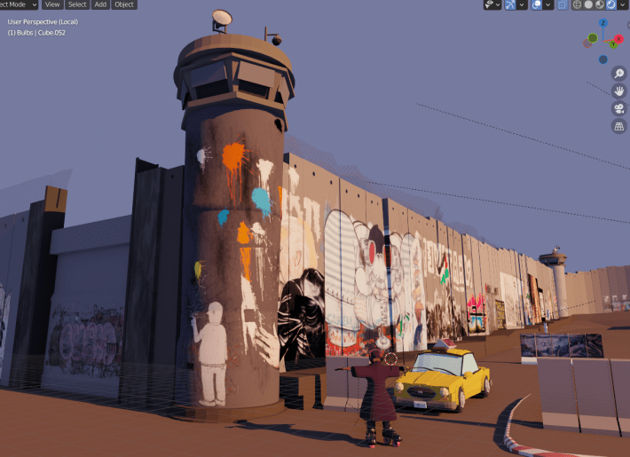 The project lead said that the initial inspiration for Palestine Skating Game came from the television show We Are Lady Parts, which follows the formation of an all-female Muslim punk band in the UK. It also came from a visit to Israel and Palestine where he saw graffiti artist Banksy’s installation in the West Bank, called the Walled Off Hotel. The Walled Off Hotel is a working hotel (which is not taking reservations at this time due to the violence in the region) that’s located in Bethlehem, next to the wall that cuts through the occupied West Bank. All of the rooms in the hotel face this wall.