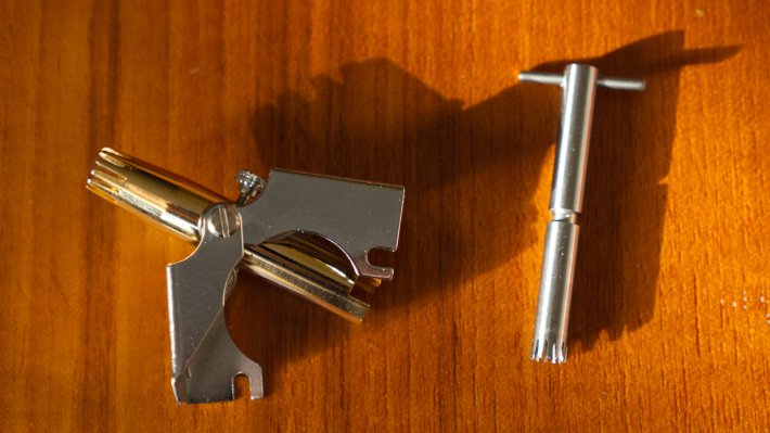 For a long time I had assumed the solution was more technology, like a quieter motor, but it turns out the opposite was true. The Royal Golden Birdie is a spartan and analog grooming device. It can be used one handed and is meant to be placed between your thumb and index finger. The tip is two interlocking crown shaped prongs that close in on each other when pressure is exerted on both sides. The only noise it makes is a charming metallic rustling sound, like a lower registered version of a barber using shears. It comes apart easily for cleaning; you simply loosen a screw on it and pull the interior layer out to be cleaned with the included brush, which also fits in the case.