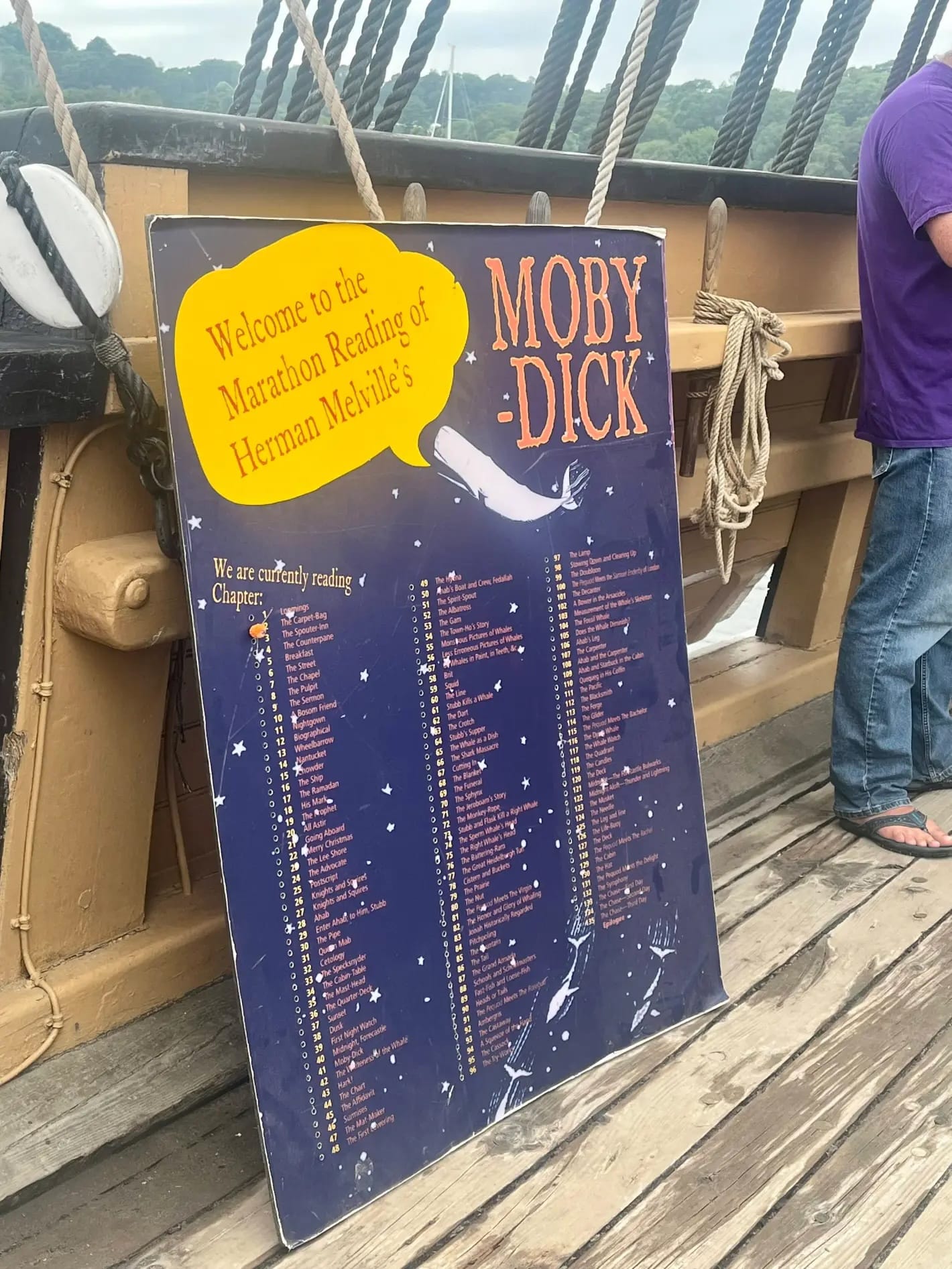 Back on the Morgan, we alternated between reading along, listening, and getting to know the people around us. We fell in with two folks whom I later learned had just met that day by sitting next to each other; one of them was here for the fourth time and had stayed overnight twice in the past, though was spending the night in her bed in Mystic for this one. She and her husband, I learned later, had both been editors at a prominent running magazine (she told me I “looked like a marathoner” when I turned the subject to running, a thrilling compliment) who’d retired to the town. Along with some friends she’d adapted short versions of classic books, including Moby Dick, a copy of which she presented to the organizers at the end. During a break for people to get things from their cars, she told me, with what I read as the love of suffering of a distance runner, that there had never been breaks in the past. But I could understand the desire for it; it felt rude to wander in and out while people were reading, but it was also hard to sit quietly for that long, reading Melville’s winding prose, and the hard deck of the Morgan and the muggy weather didn’t make it much easier.