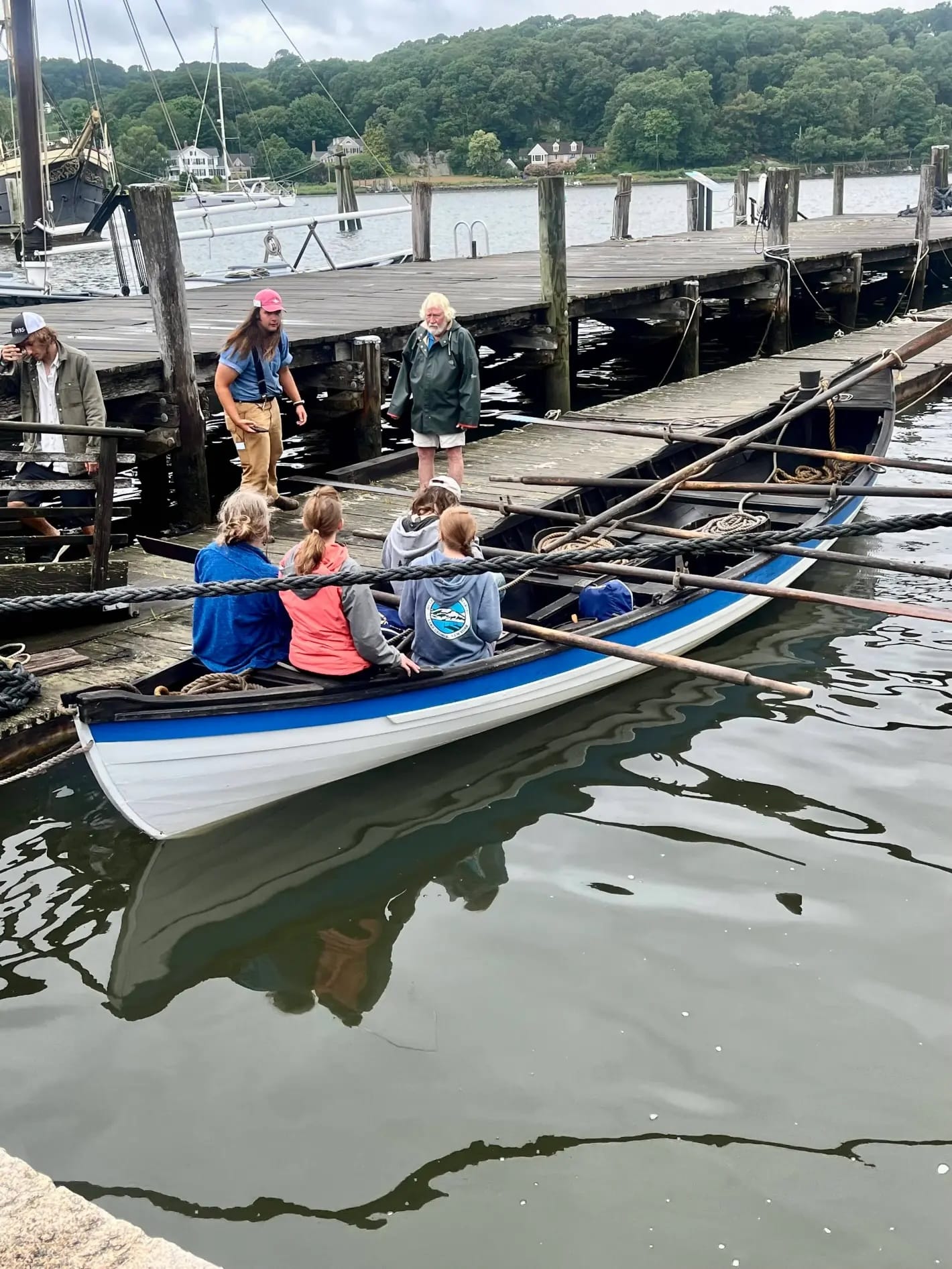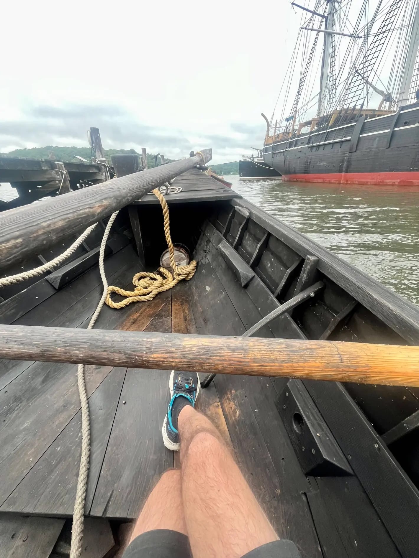 Before the reading started again we had the opportunity to take whaleboats out on the water. I tend to think I’m too cool for such novelties or worry that I’m inconveniencing the people providing them, but I told myself to get over it because this was too special a chance to pass up. The sea-grizzled older man organizing things asked if anyone knew how to row, and when no one else in my group raised their hands I admitted I’d rowed some crew in college. I regretted this (I was, in the words of my coach, a “team builder,” though a shit rower) when the man put me in a key position at the front of the boat and told everyone to watch how I handled its nearly 20-foot wooden oar. But it came back to me quickly, and I did my best to follow our captain’s instructions and lead everyone in a row past the front of the Morgan into the river, where he proudly told us few people get to see the boat from this angle. He told us facts about whaleboats and how to handle them, then instructed us on how to turn around and row back. I peppered him with questions as we went–how did he know all of this, where had the Morgan sailed, what was it like to sail with it, why didn’t it sail anymore–that he politely but briskly answered. As it was surely intended to, the small boat against the size of the Morgan drove home the picture Melville paints, how frightening and flimsy whaling must have felt, with nothing but wood and metal and ropes between whalers, their quarry, and the sea.